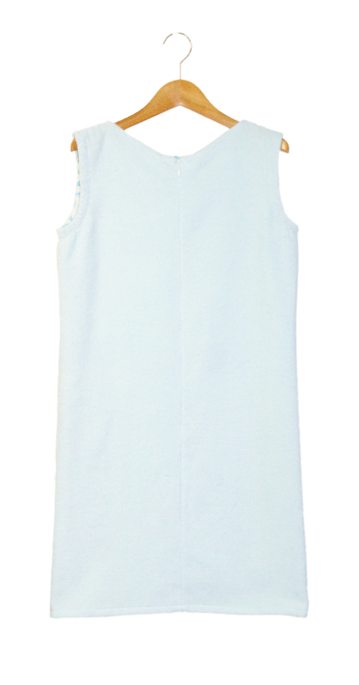 薄手でとても柔らかい高品質な綿100%生地。水色のタオル地でできた夏のワンピース。着丈89センチでひざ丈少し上(ウエストから裾まで約50センチ)。全体にピッタリめ。