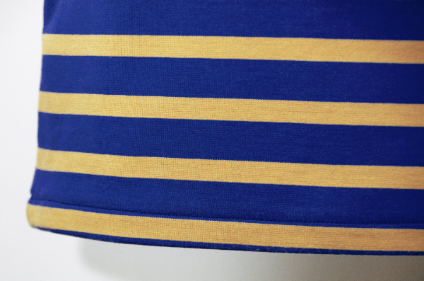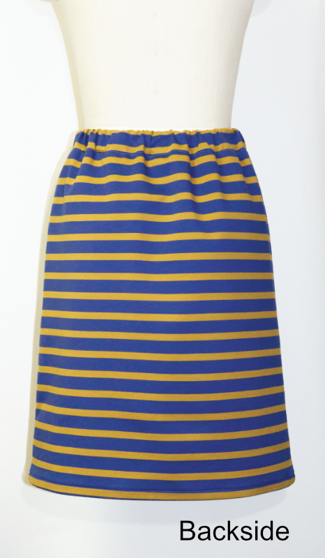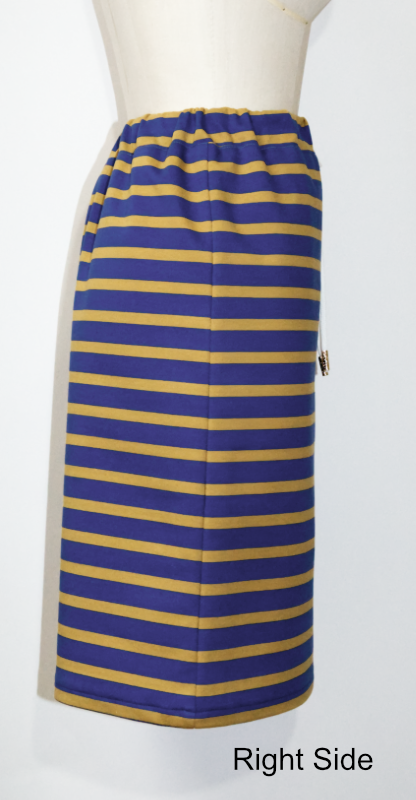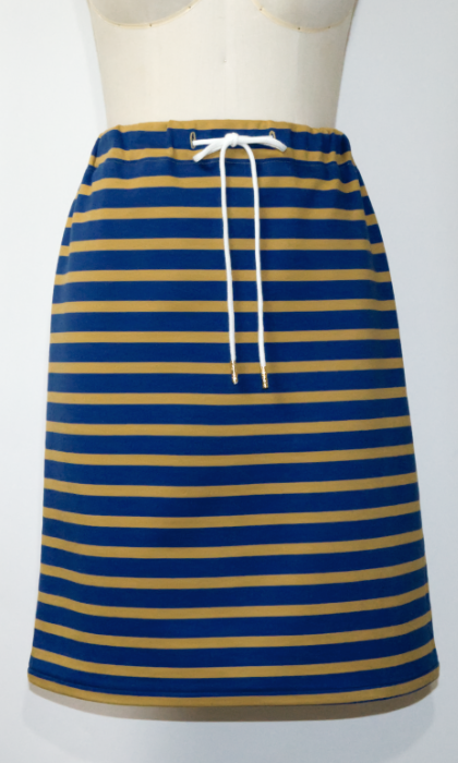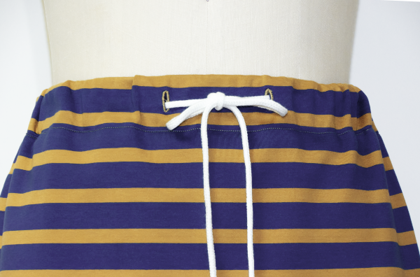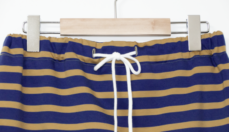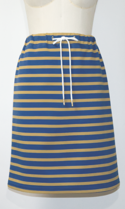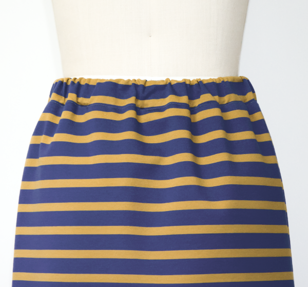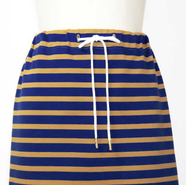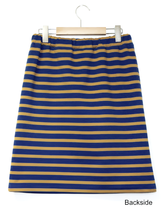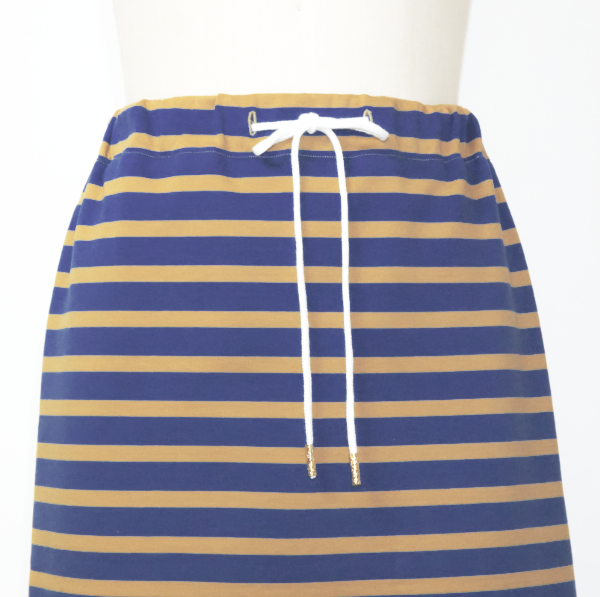 ブルーとゴールド色のボーダー柄のニットスカート。ウエストは、ゴム入り&ひも入りで調整が便利。