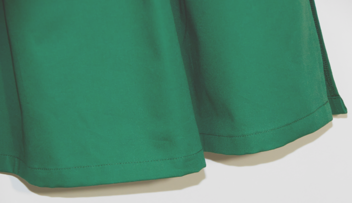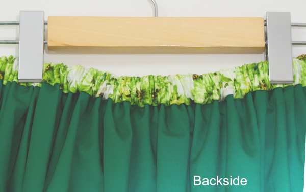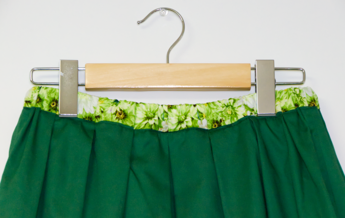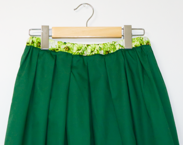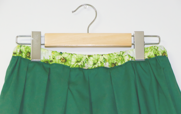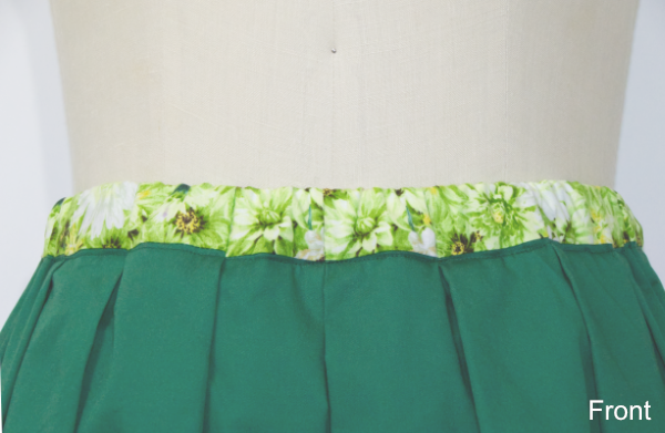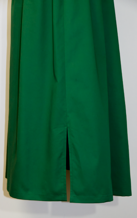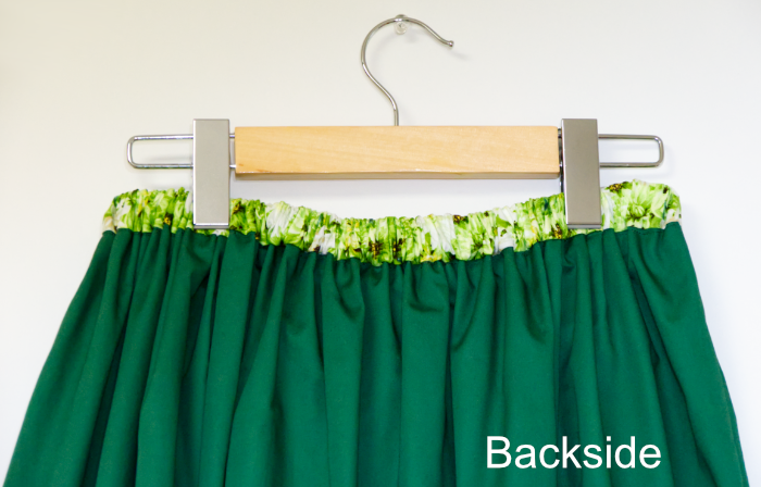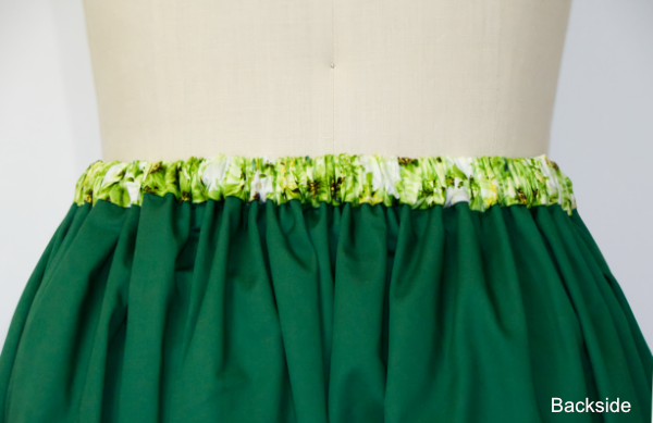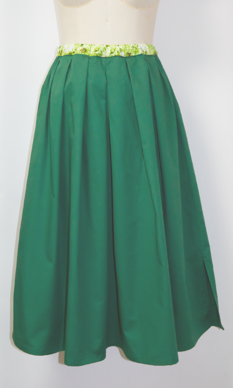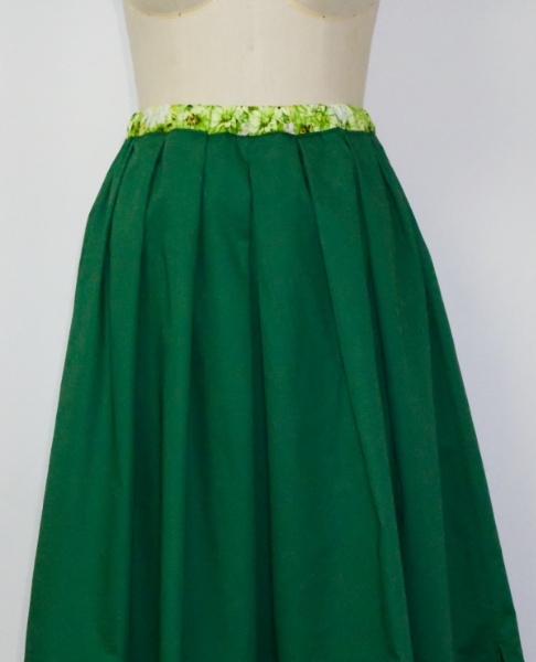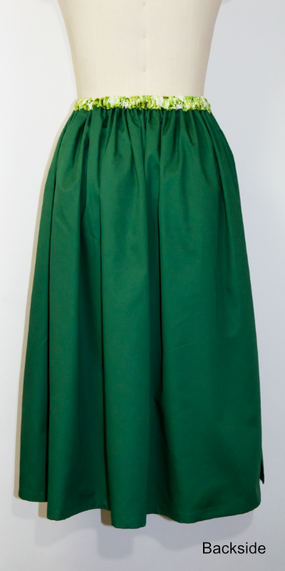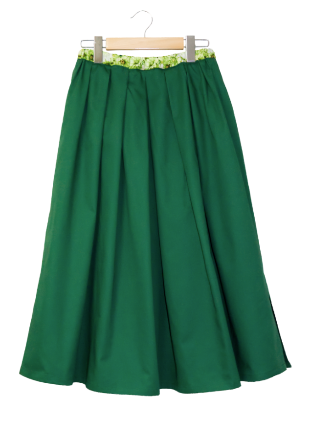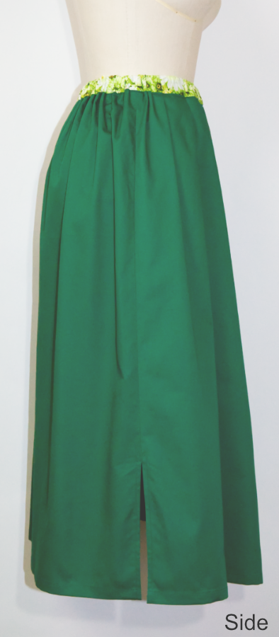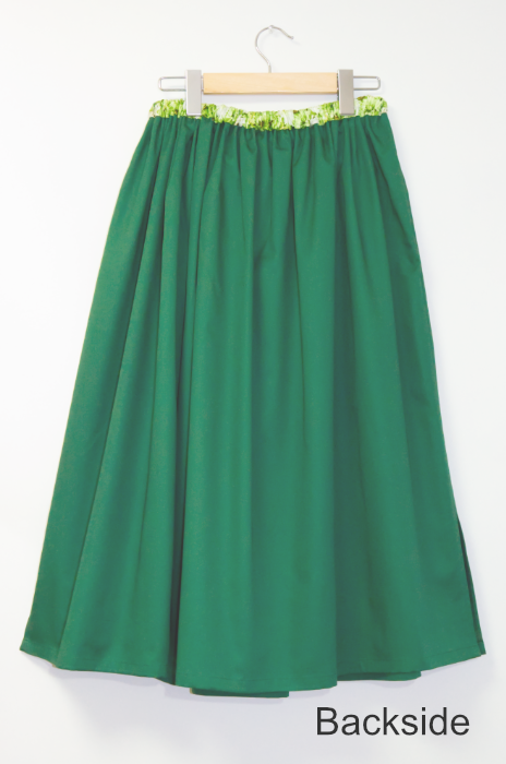 ウエストにタックの入ったロングスカート。ウエストに花柄のデザイン入り。ウエストはゴム入り。ウエストサイズ64センチ前後の人向け。着丈は76センチ。両サイドに裾から上に向けてスリット入り。トルソー(マネキン)のサイズは、ウエスト63センチ、ヒップ90センチ。