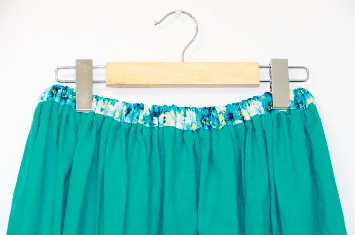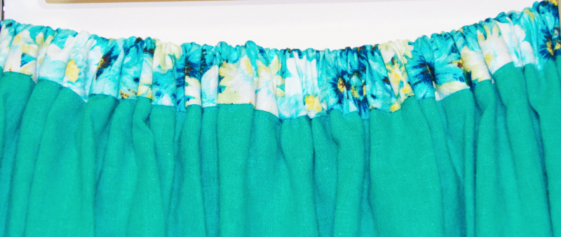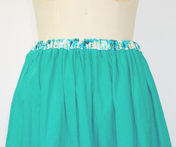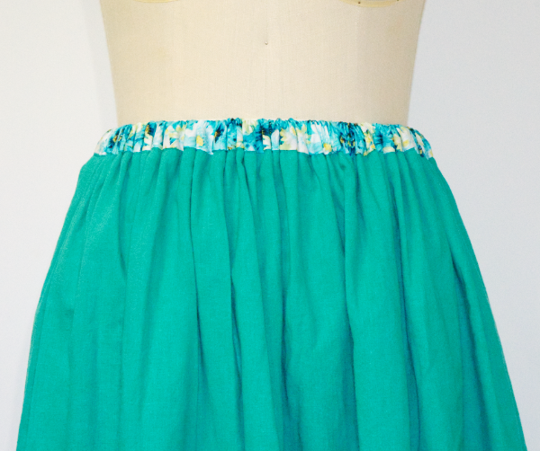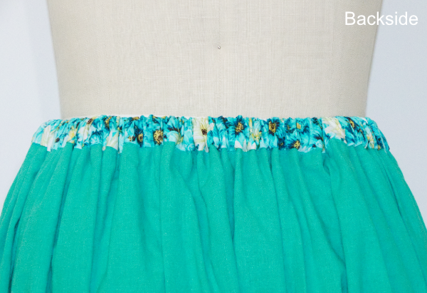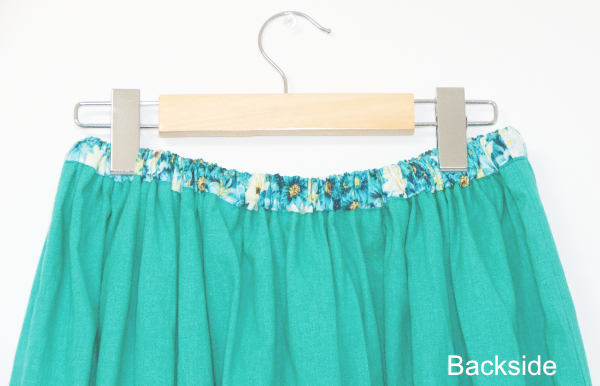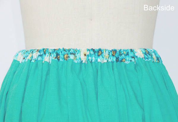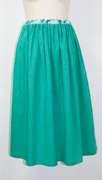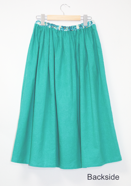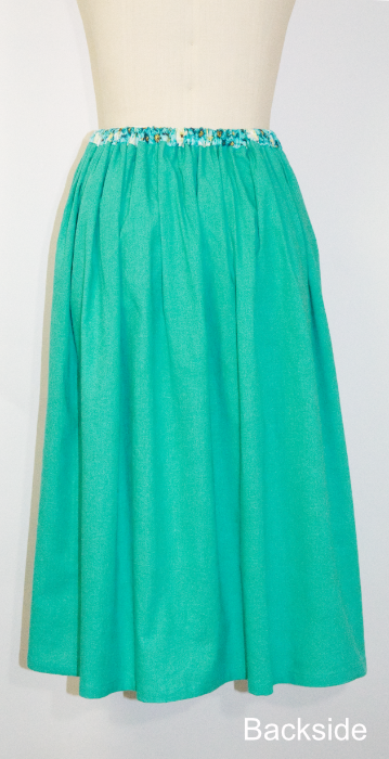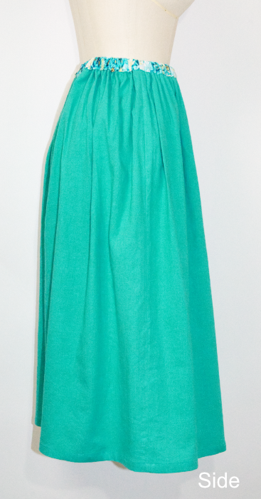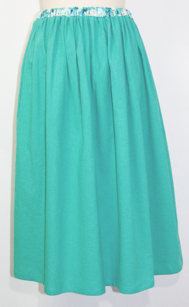 ウエストゴム入りのロングスカート。生地色は鮮やかなターコイズブブルー色。ウエストは花柄のデザイン入り。