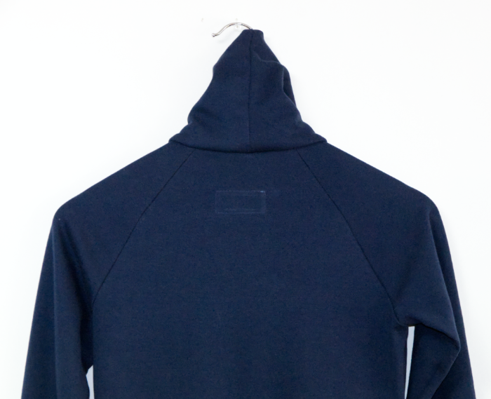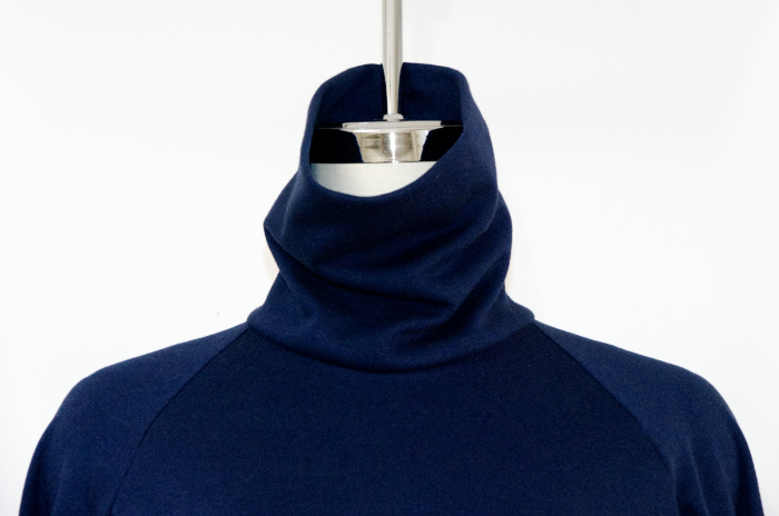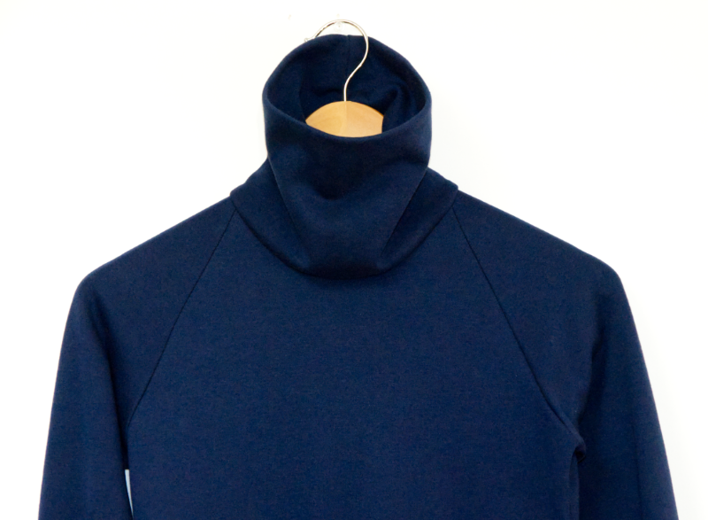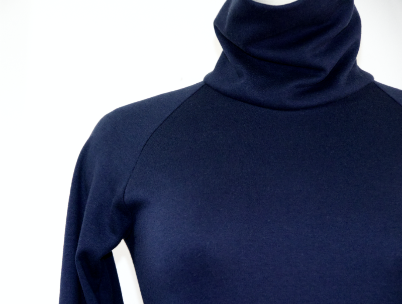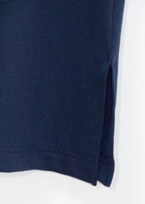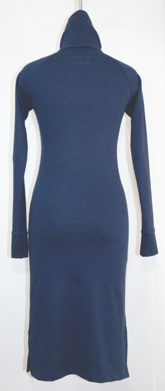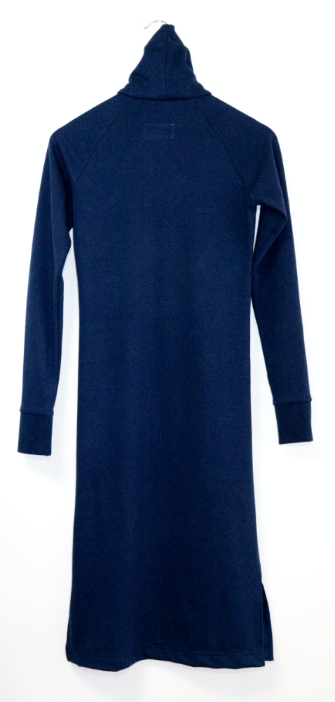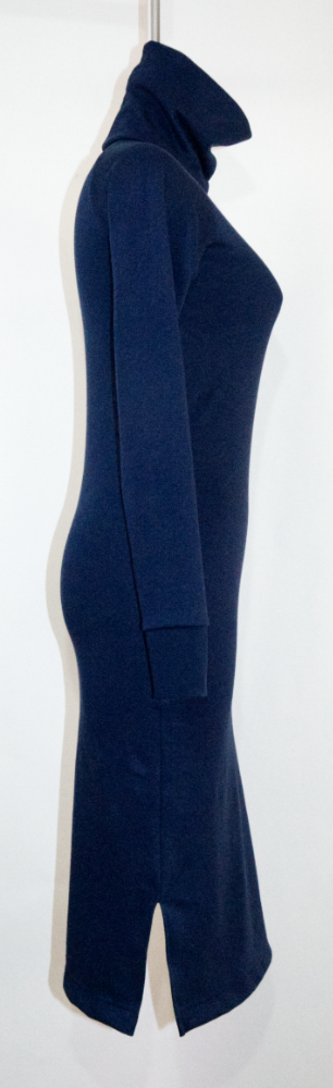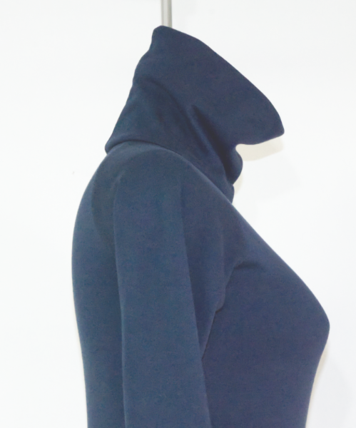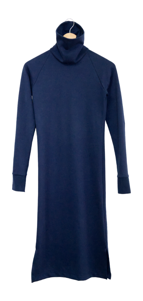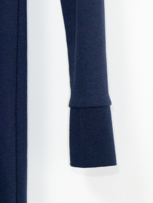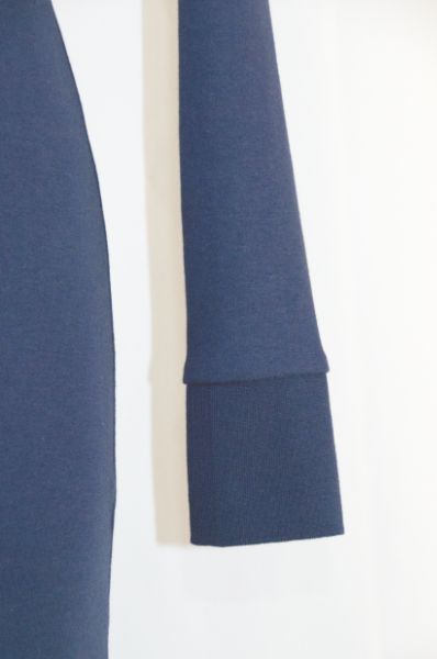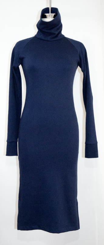 ニット系ストレッチ生地でできた紺色のワンピース。