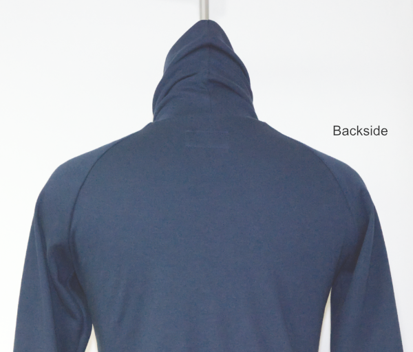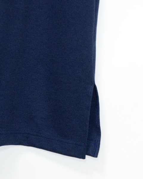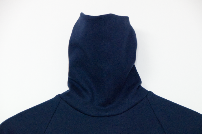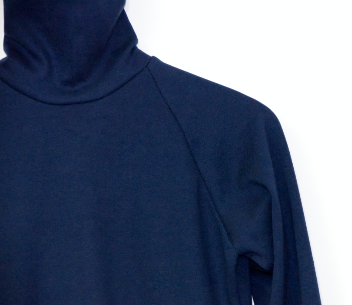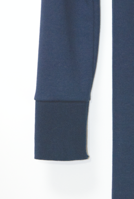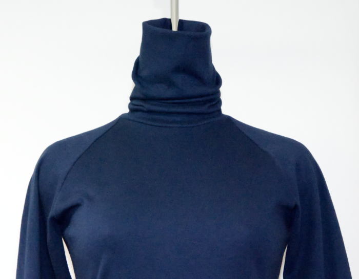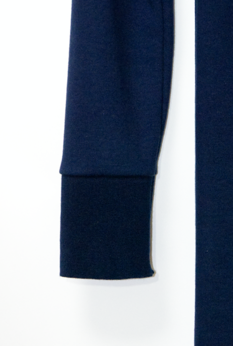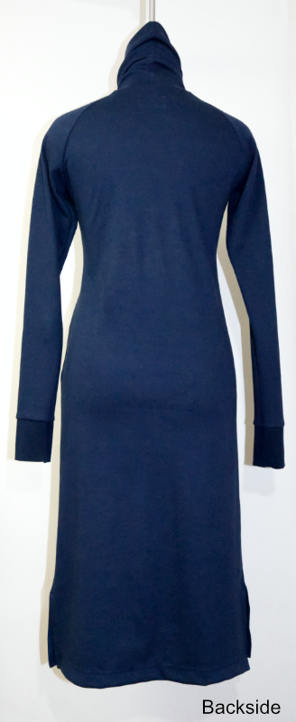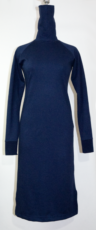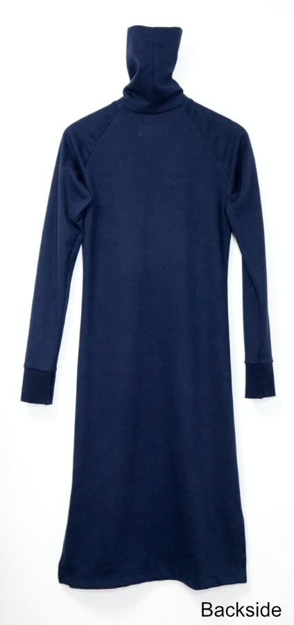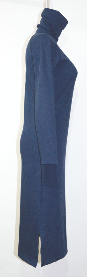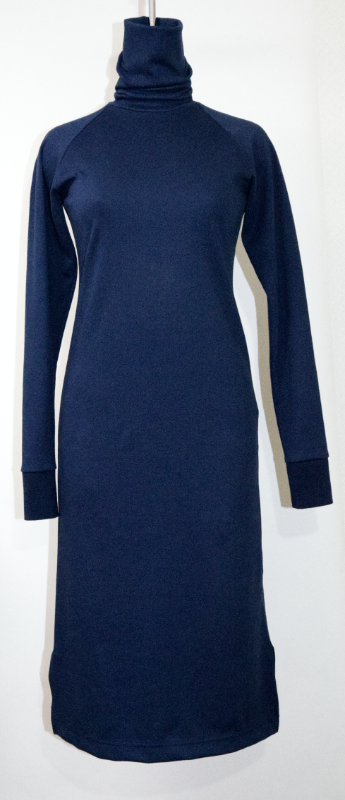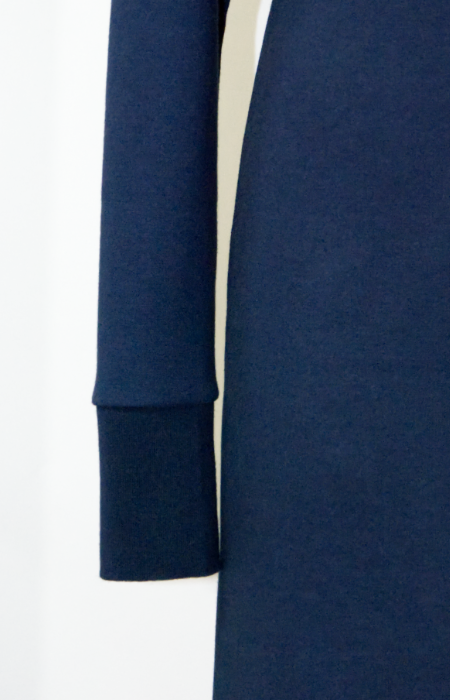 ニット系ストレッチ生地でできた紺色のワンピース。