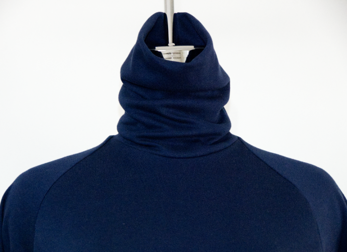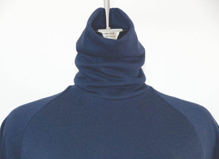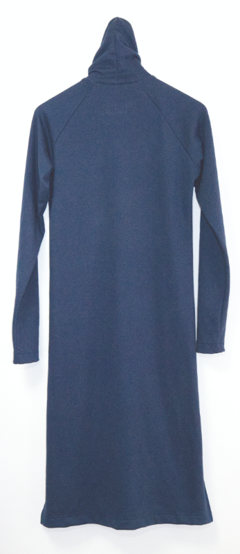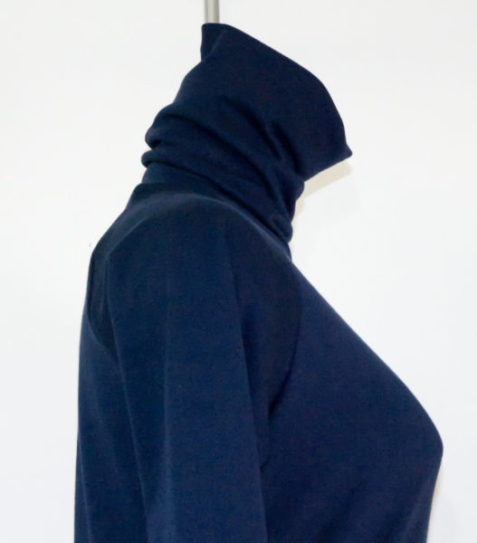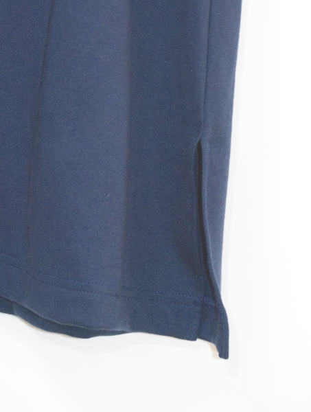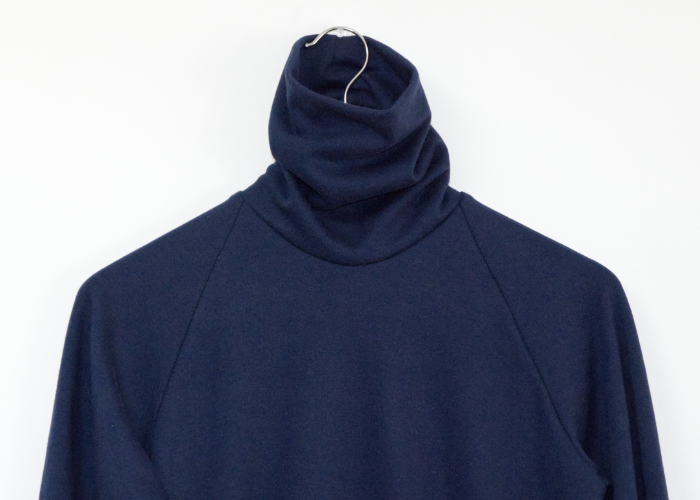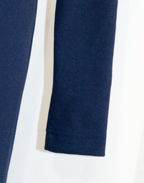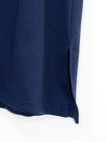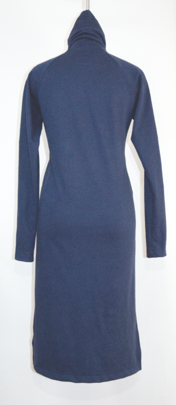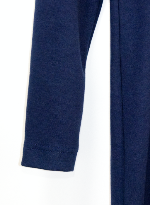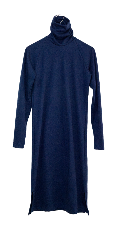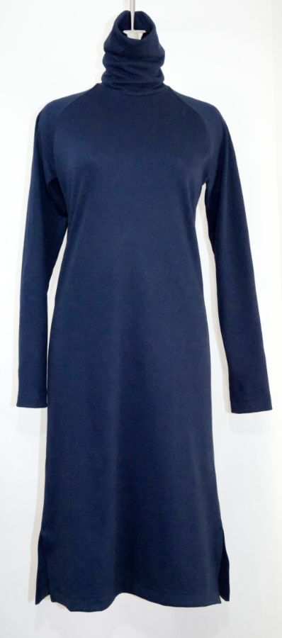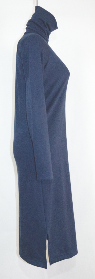 ニット系ストレッチ生地でできた紺色のワンピース。