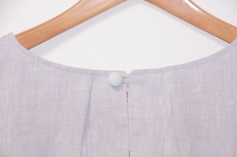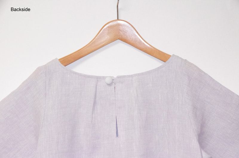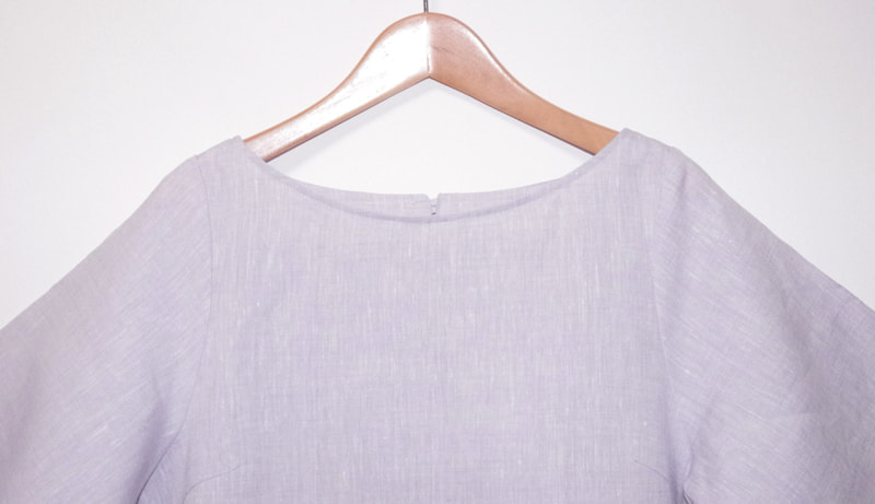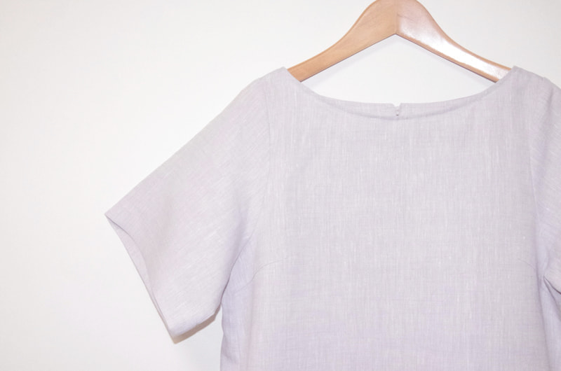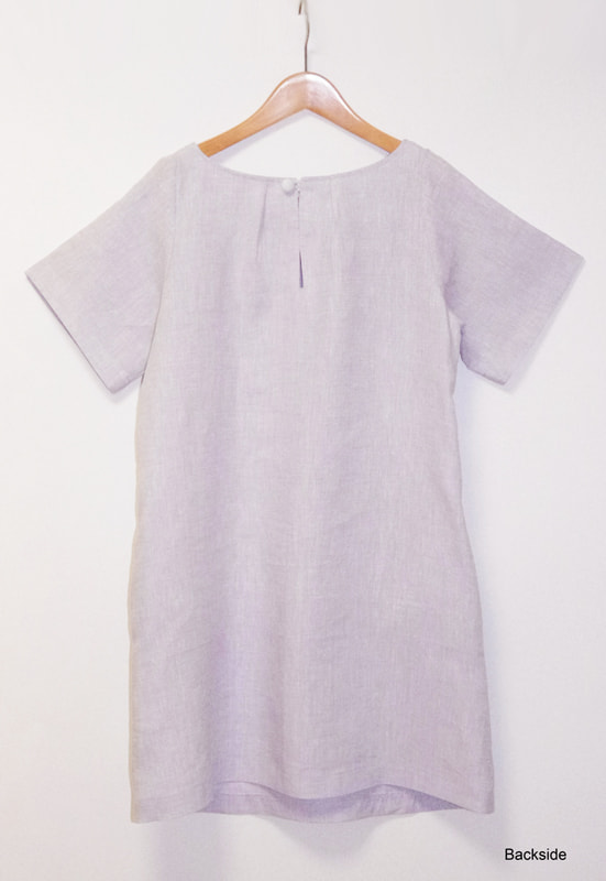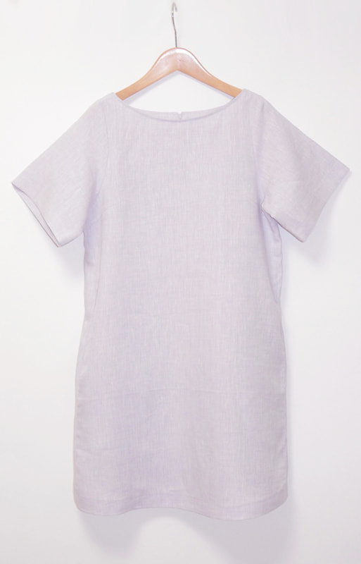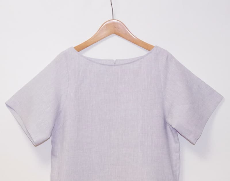 夏向けの涼しい半袖のリネンワンピース。首回りはボートネック。
