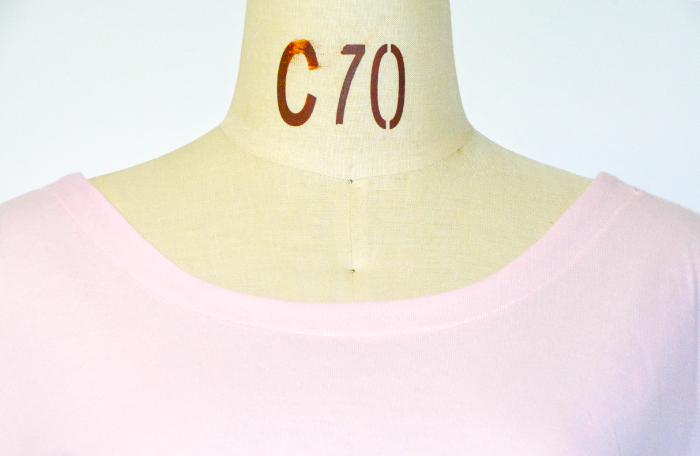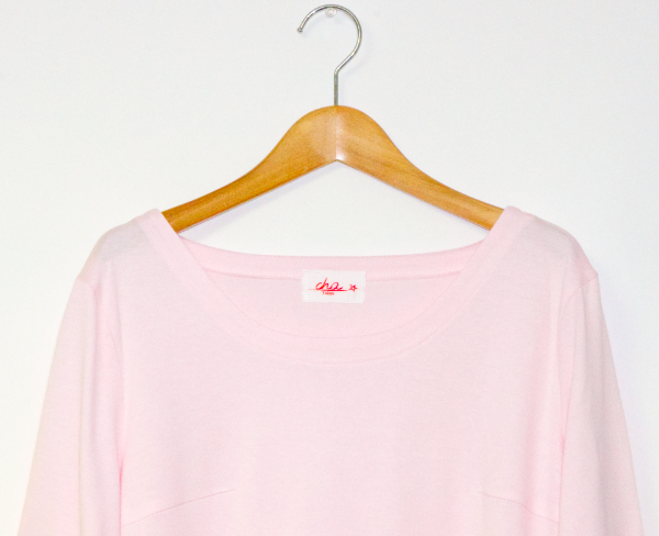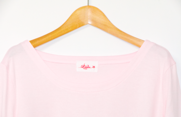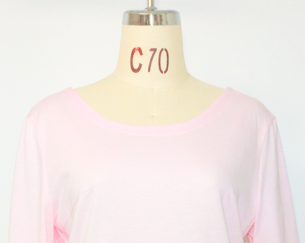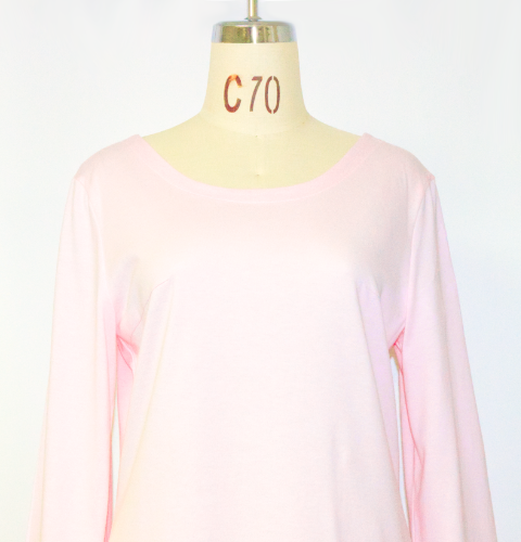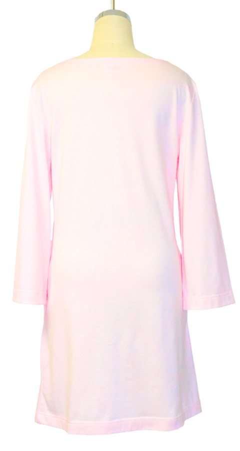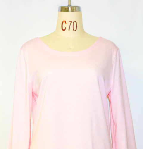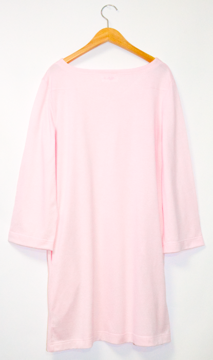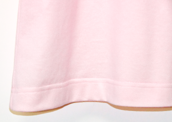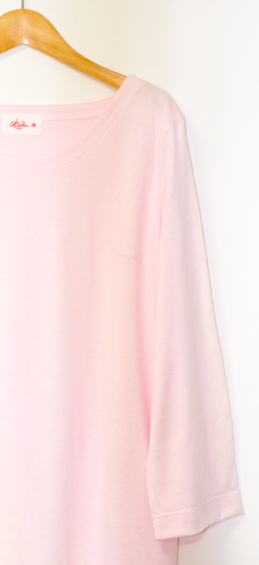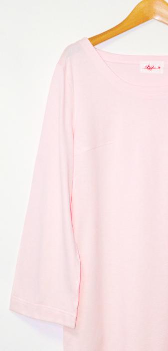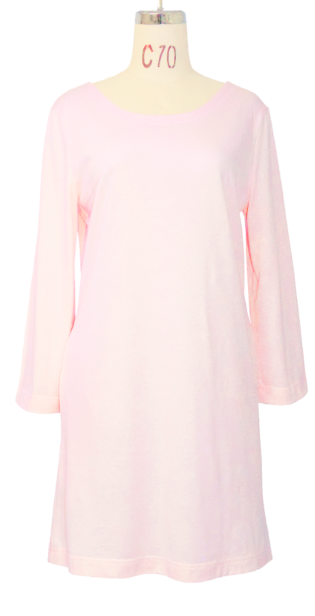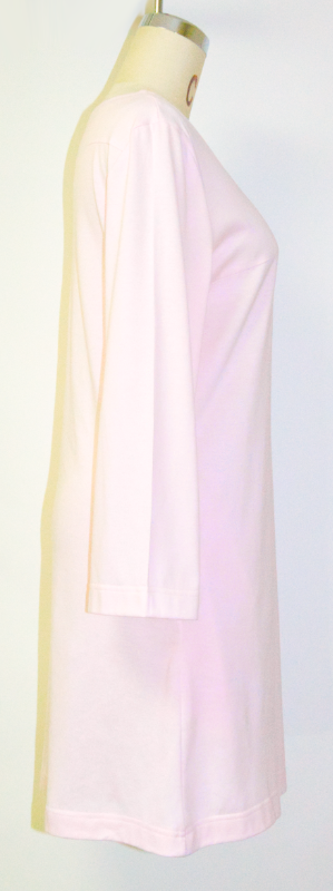 薄手でとても柔らかい綿100%生地。ピンク色のニット系ストレッチコットン生地でできた春ワンピース。着丈88センチでひざ丈。