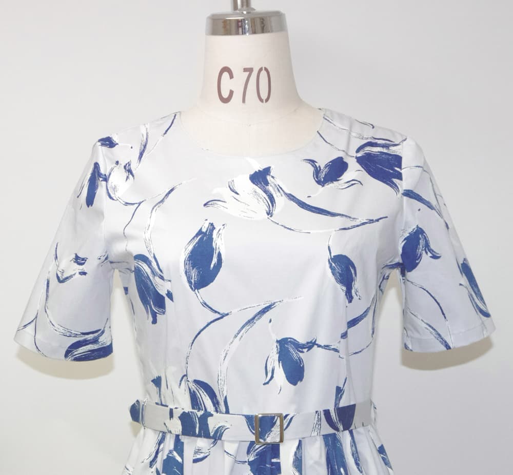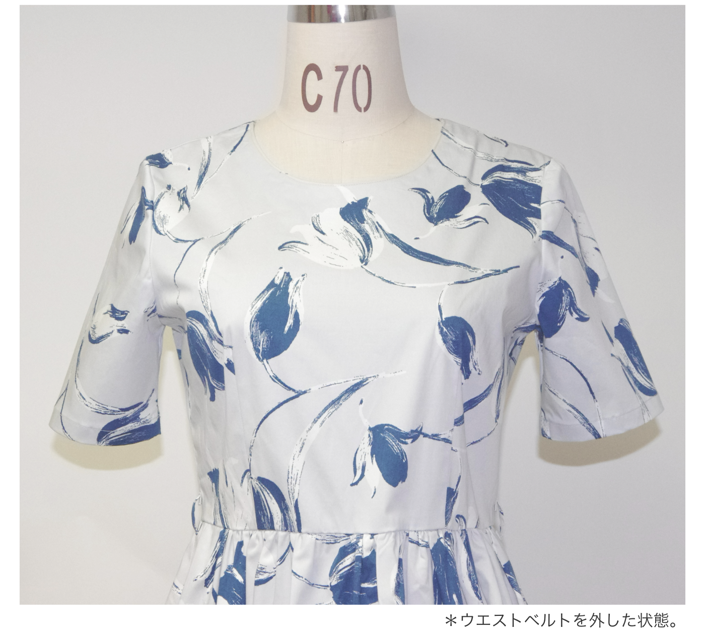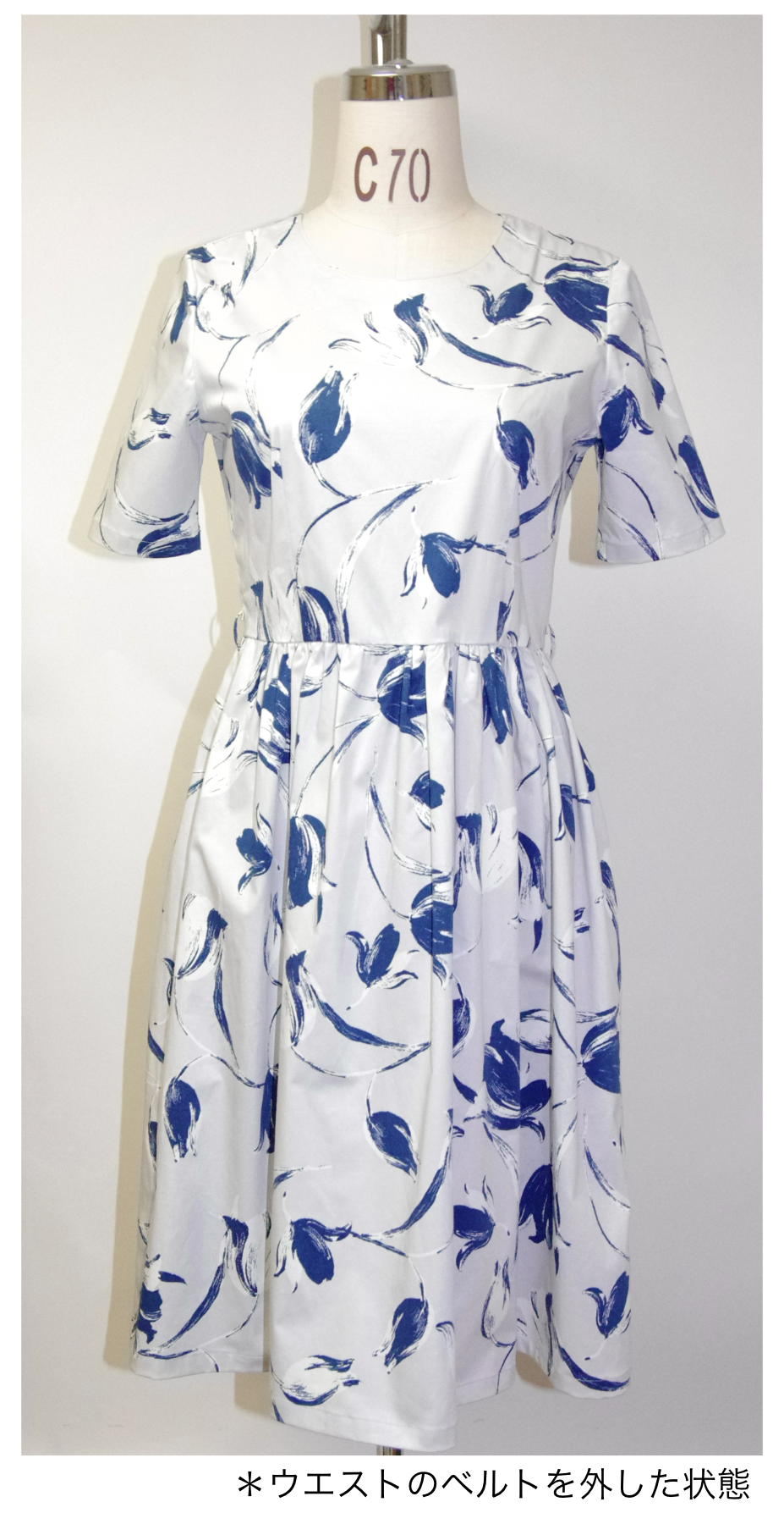 半袖のスタンダード夏ワンピース。コットン98%の中厚生地。ポリウレタン2%が入っていて横方向にストレッチ感あり。ブルーチューリップ柄がグレー地に映える。ベルト付き。
