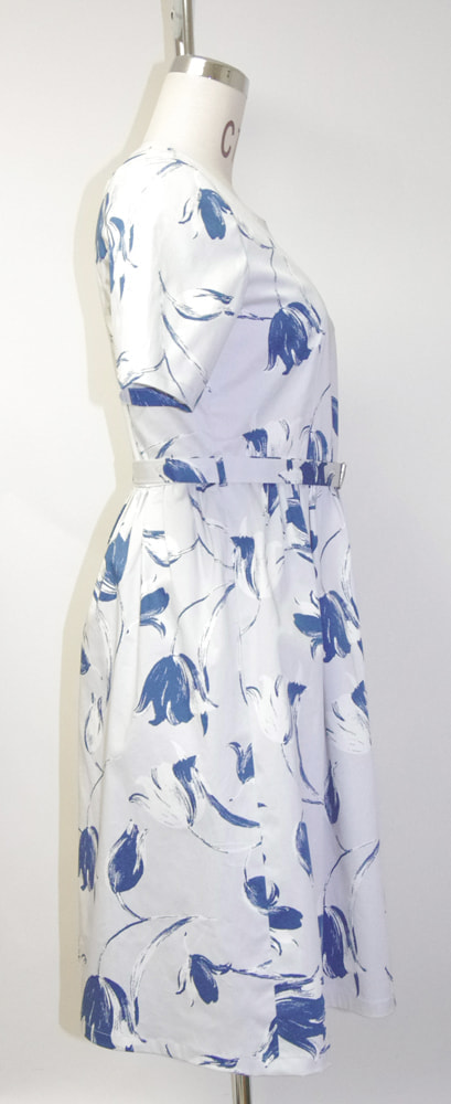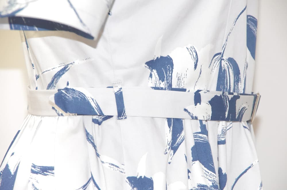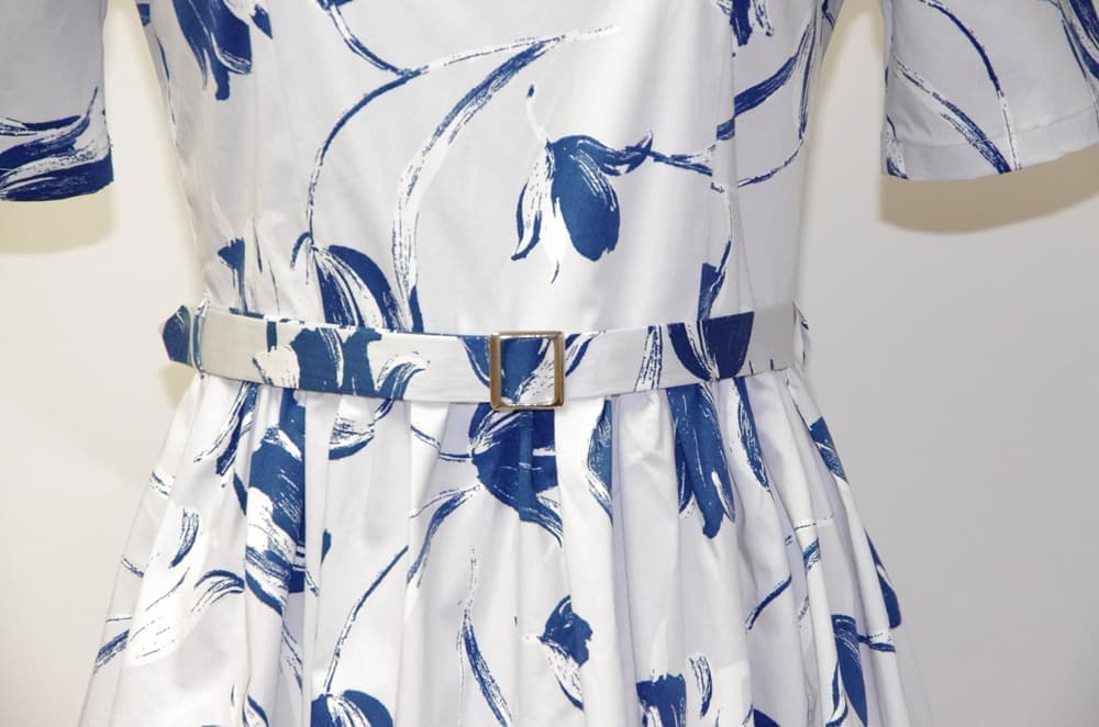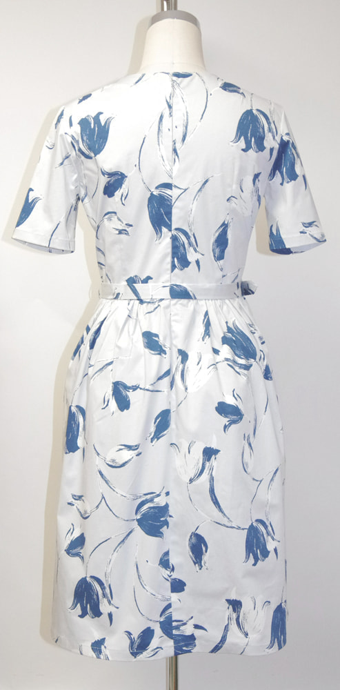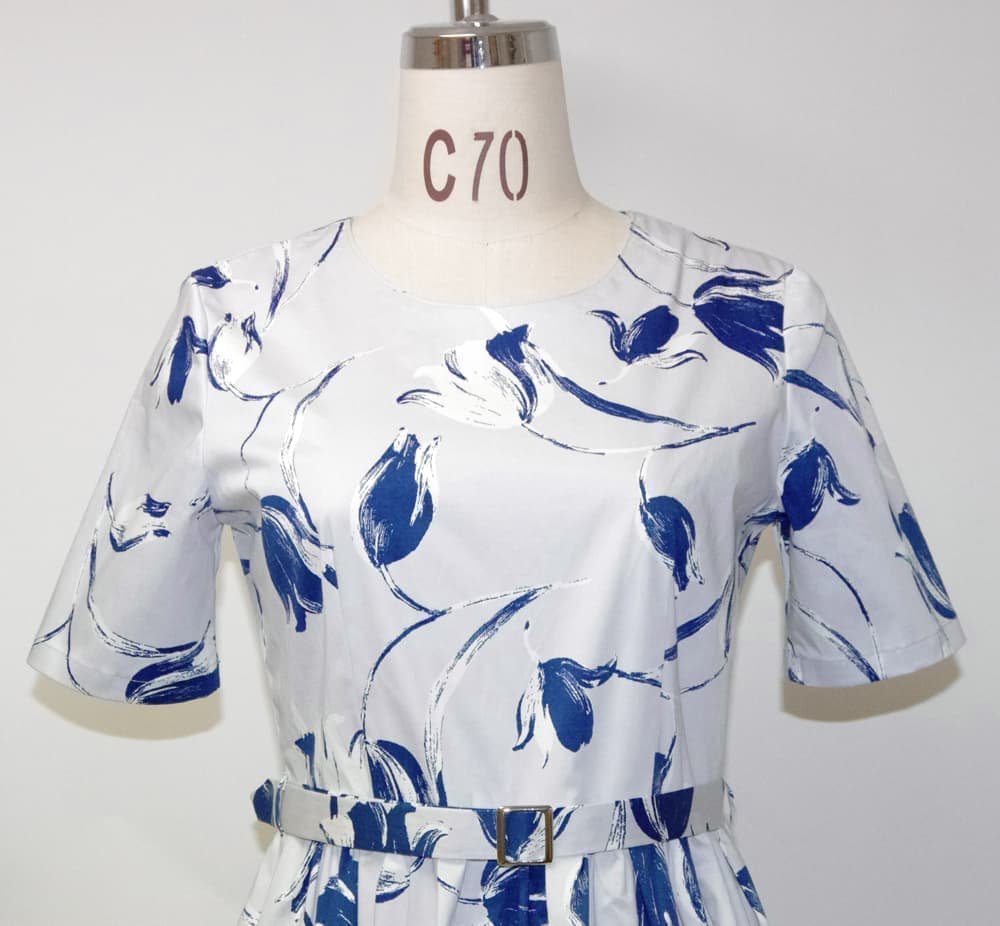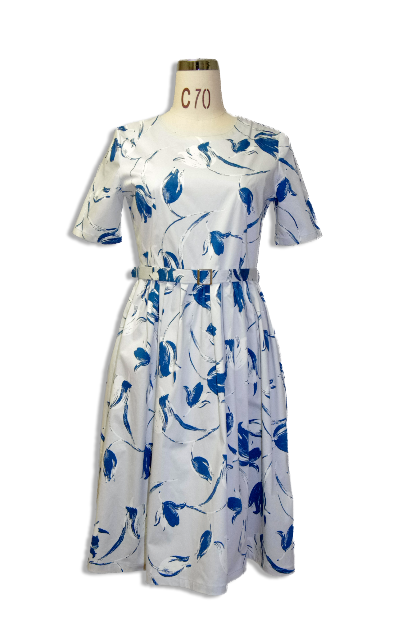 半袖のスタンダード夏ワンピース。コットン98%の中厚生地。ポリウレタン2%が入っていて横方向にストレッチ感あり。ブルーチューリップ柄がグレー地に映える。ベルト付き。