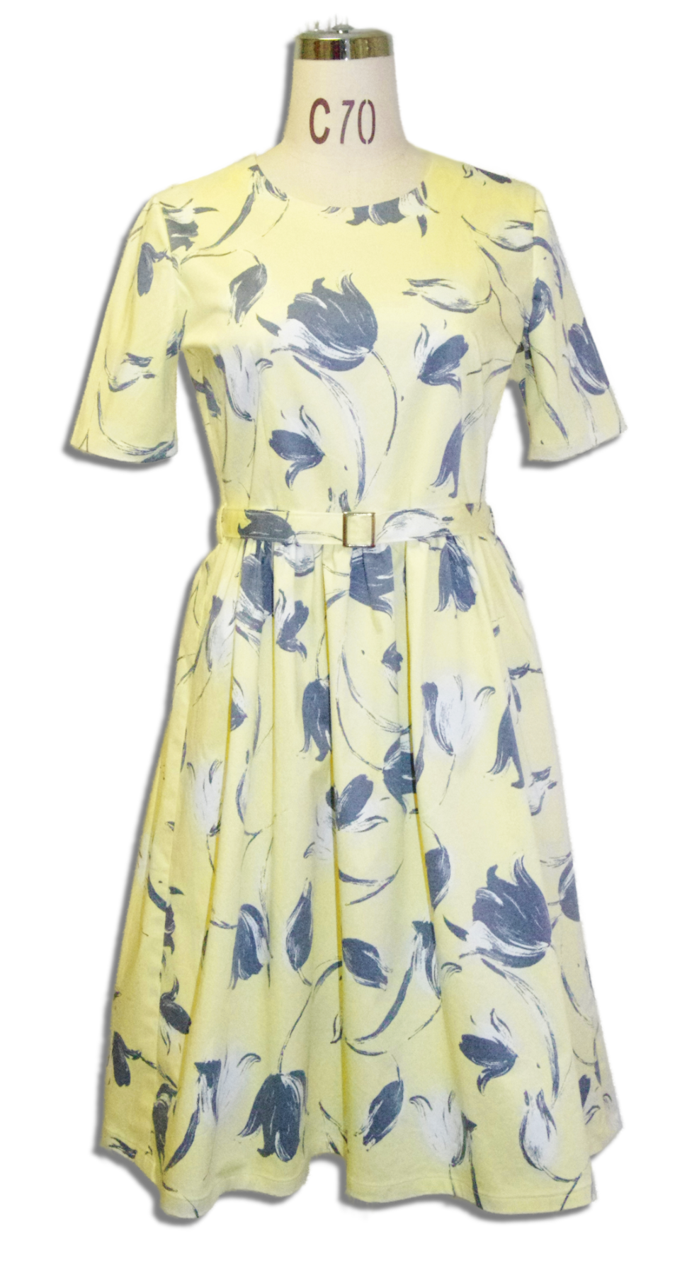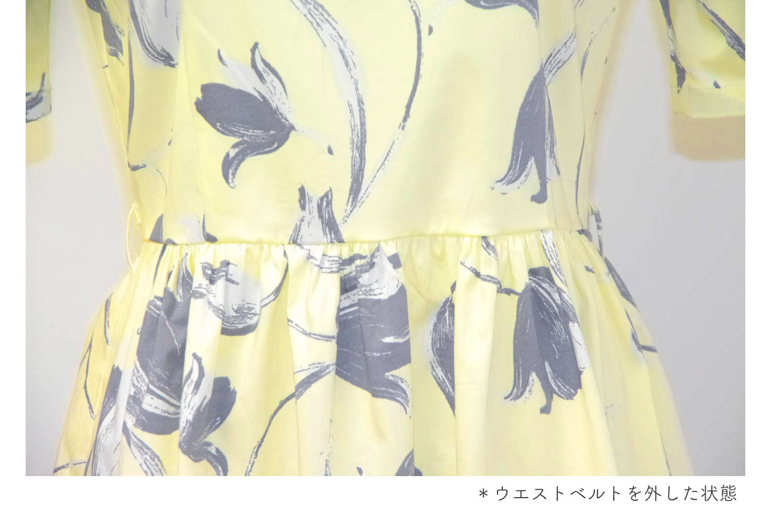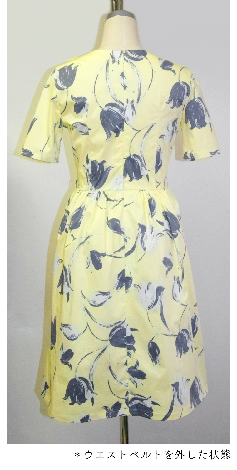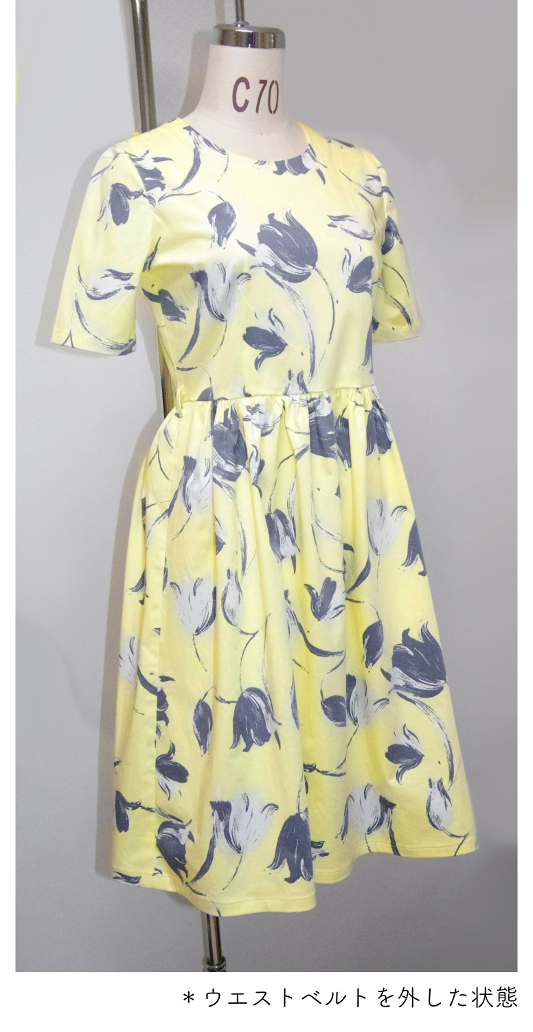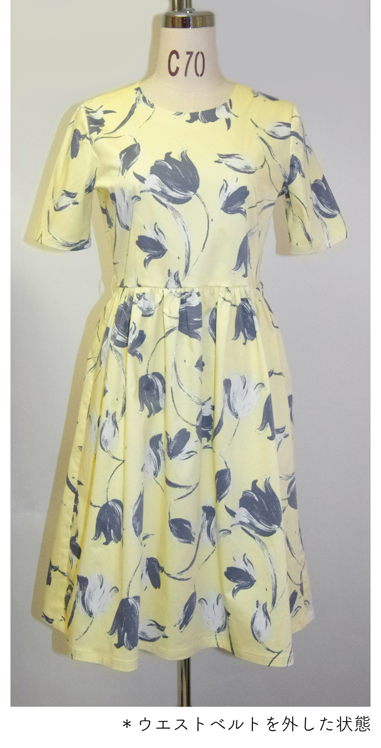 半袖のスタンダード夏ワンピース。コットン98%の中厚生地。ポリウレタン2%が入っていて横方向にストレッチ感あり。薄いイエローにお洒落なチューリップ柄。ベルト付き。