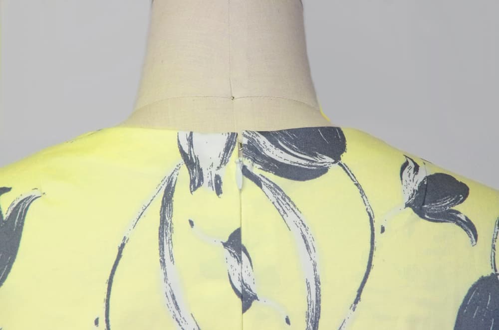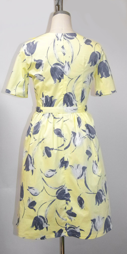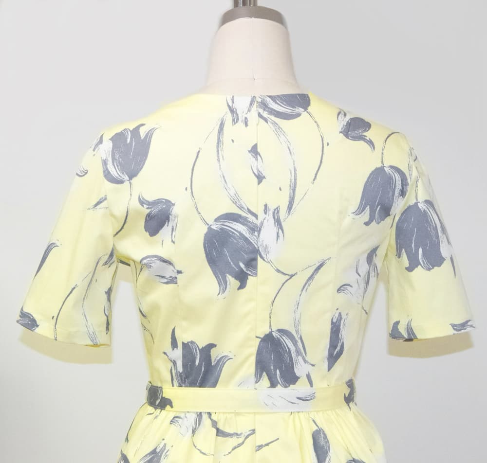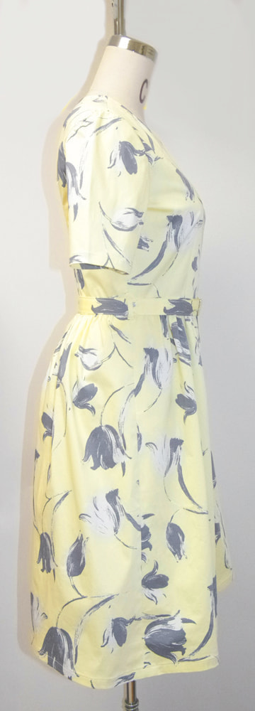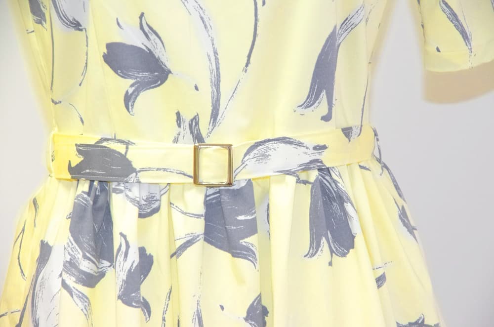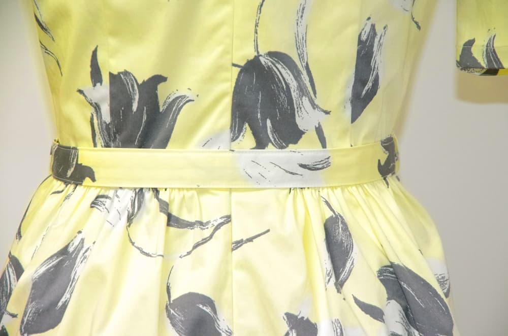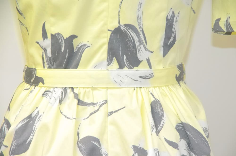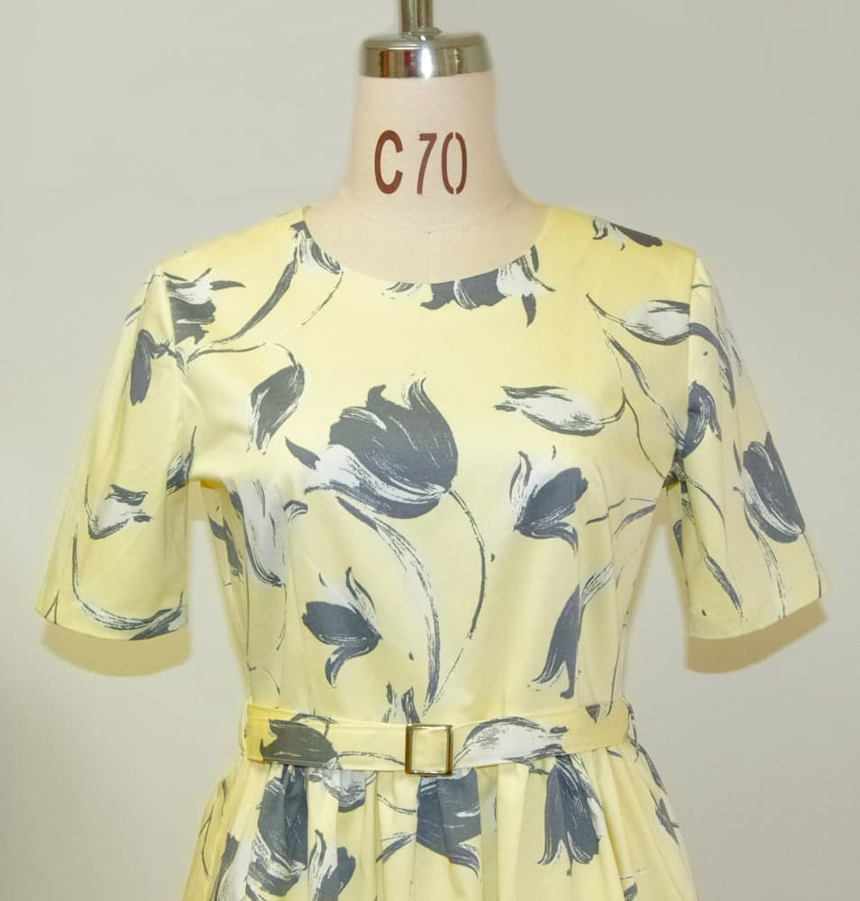 半袖のスタンダード夏ワンピース。コットン98%の中厚生地。ポリウレタン2%が入っていて横方向にストレッチ感あり。薄いイエローにお洒落なチューリップ柄。ベルト付き。