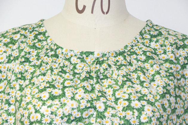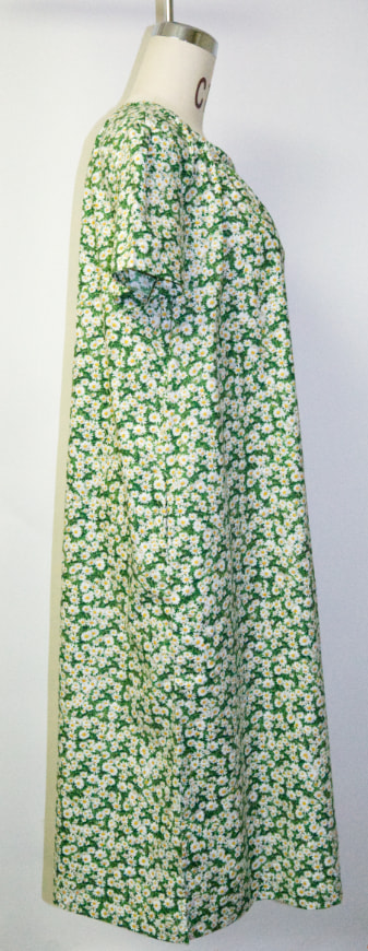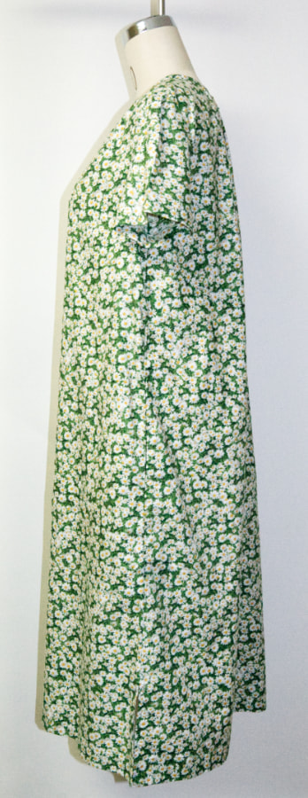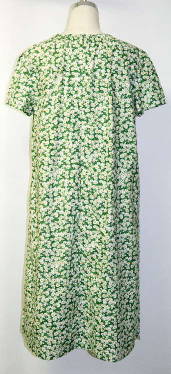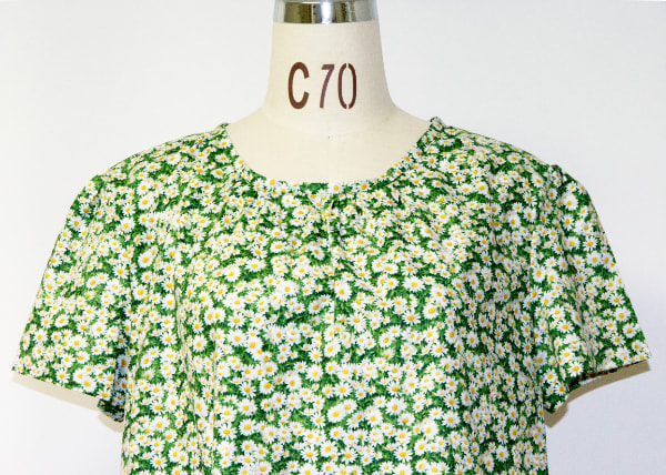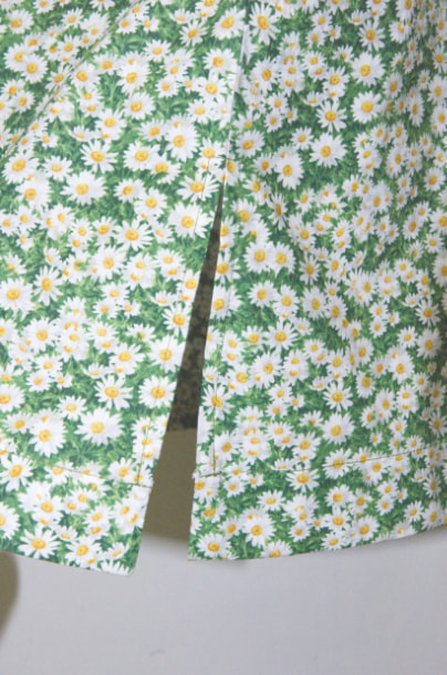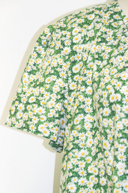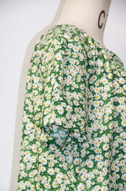 艶やかな緑色の草原に咲き乱れるマーガレットの花柄のワンピース。生地は、薄い~中厚程度で軽く、肌触りのあっさりした夏ワンピ。