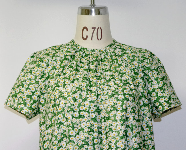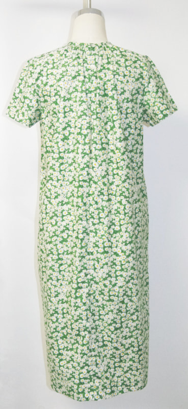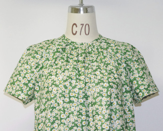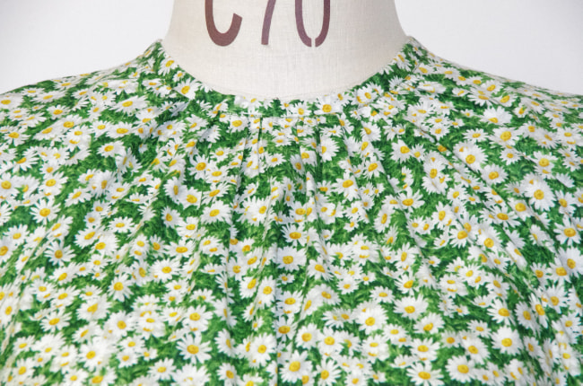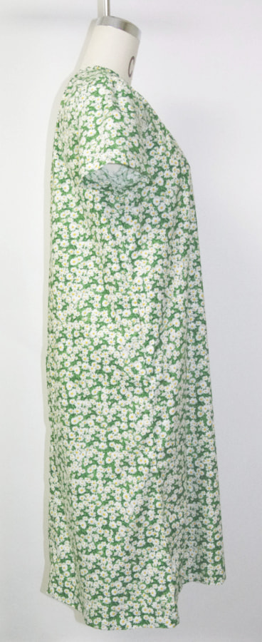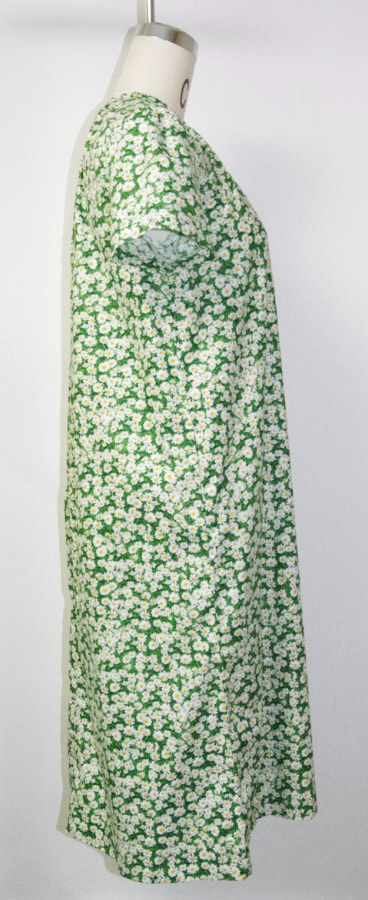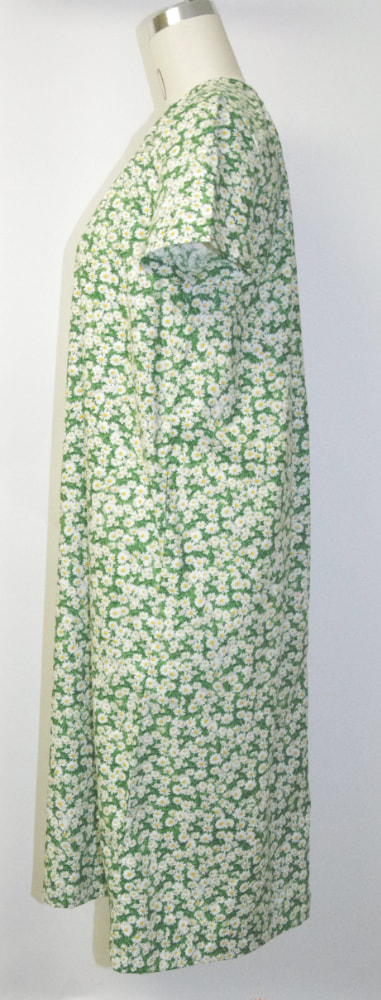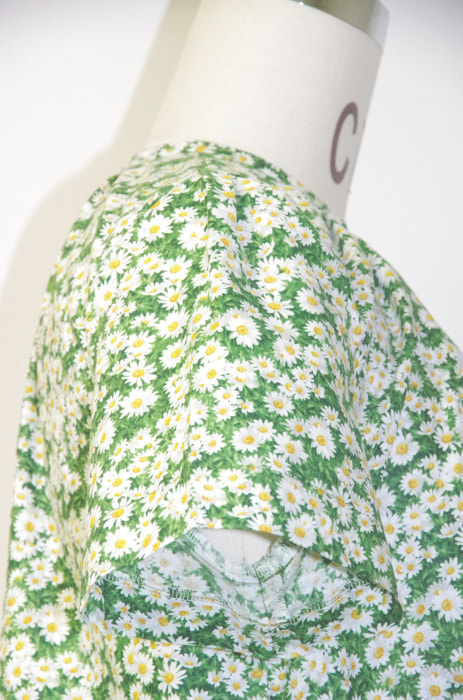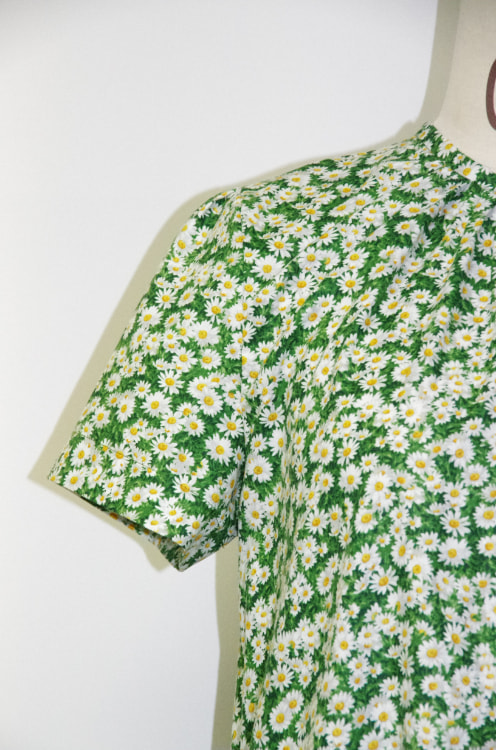艶やかな緑色の草原に咲き乱れるマーガレットの花柄のワンピース。生地は、薄い~中厚程度で軽く、肌触りのあっさりした夏ワンピ。