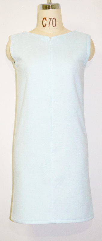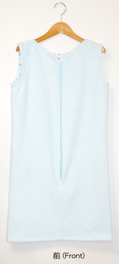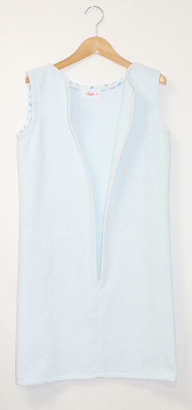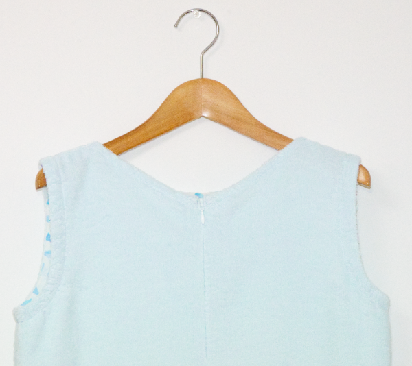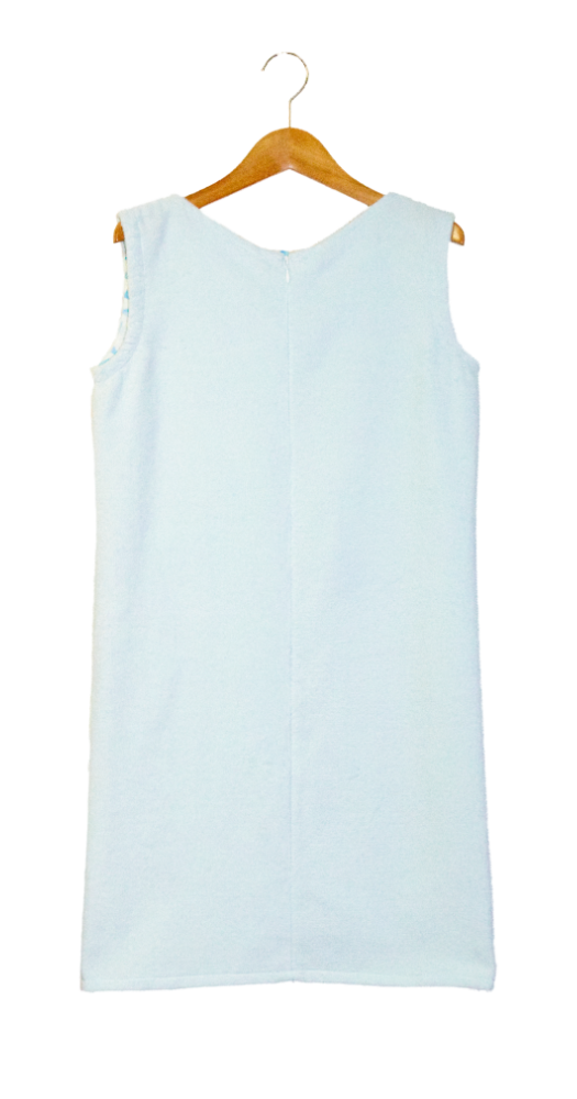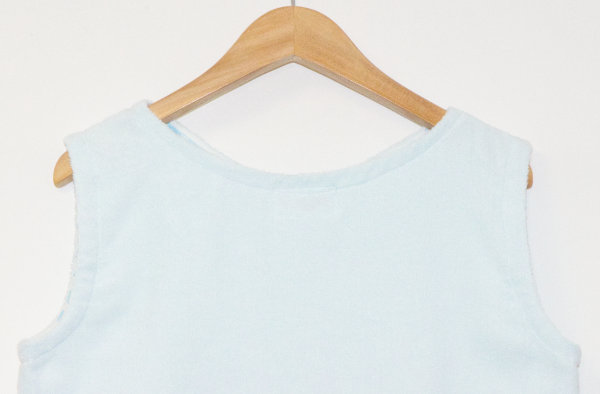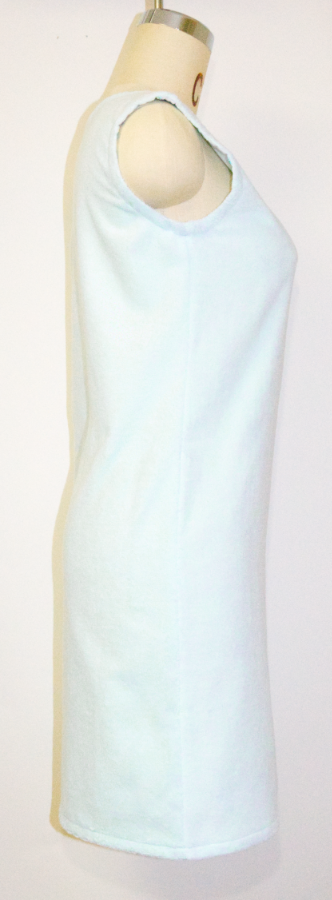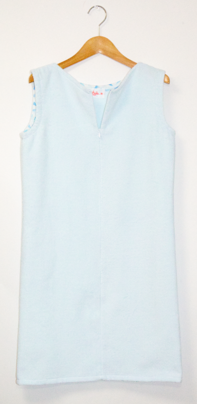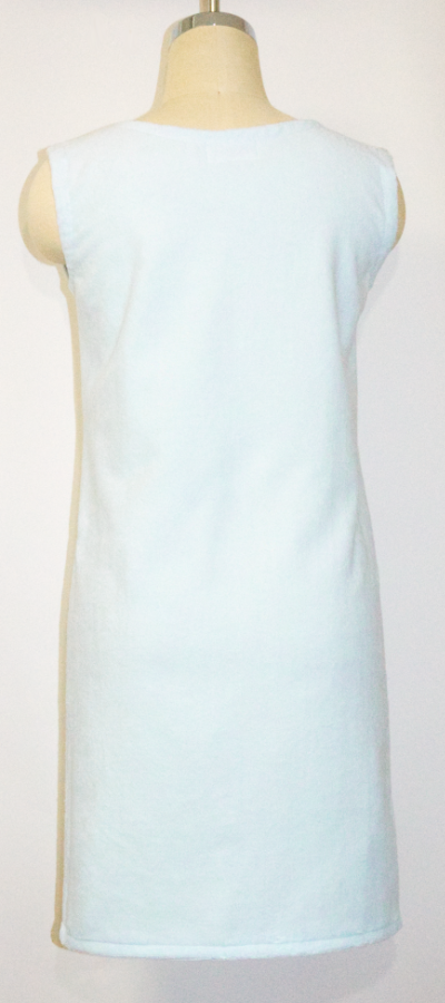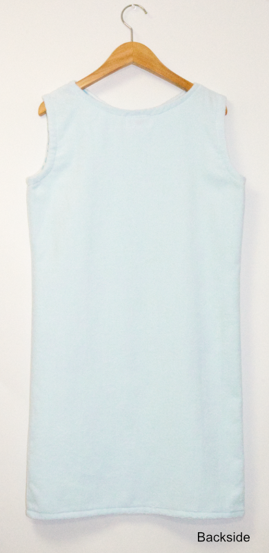 薄手でとても柔らかい高品質な綿100%生地。水色のタオル地でできた夏のワンピース。着丈89センチでひざ丈少し上(ウエストから裾まで約50センチ)。全体にピッタリめ。