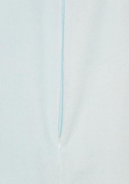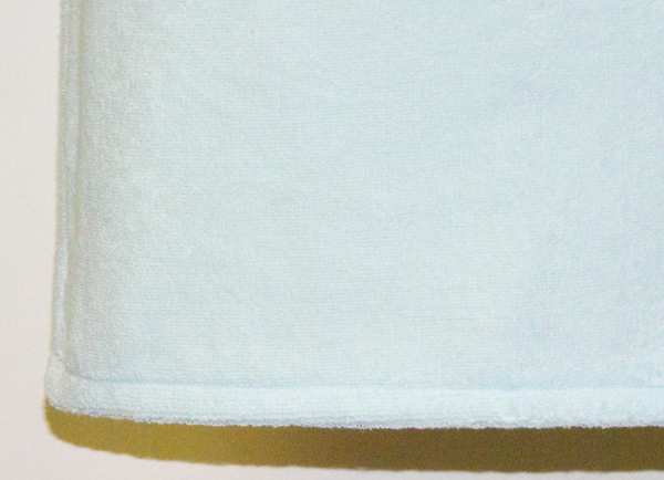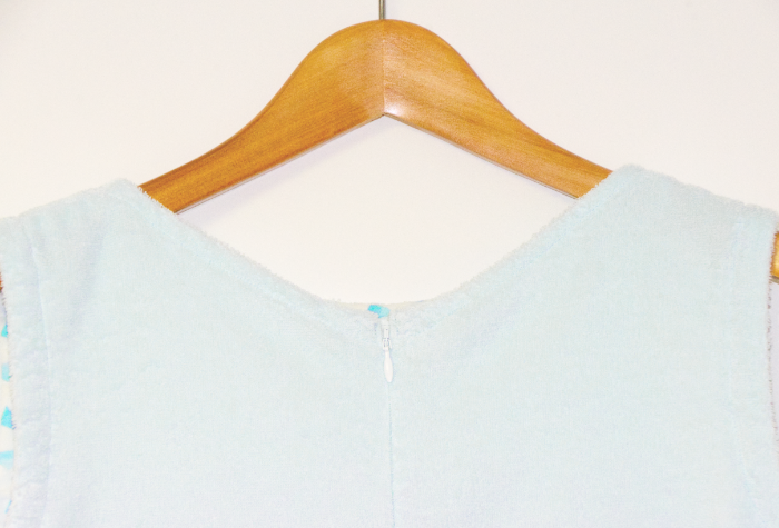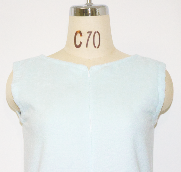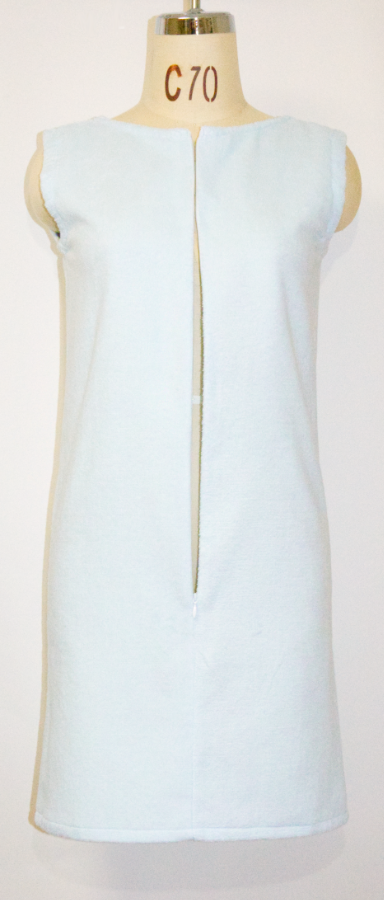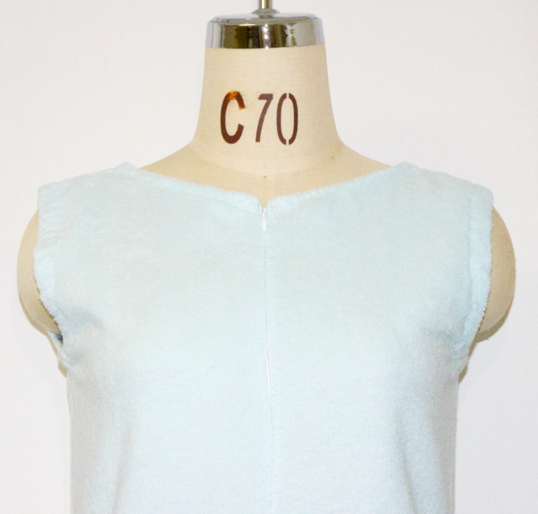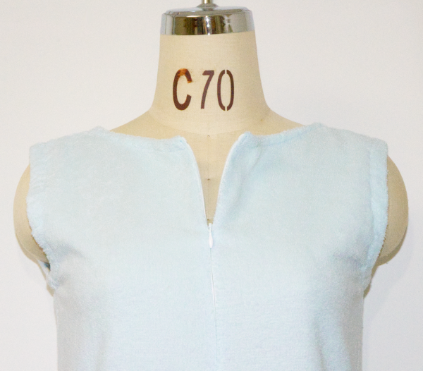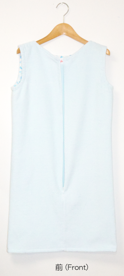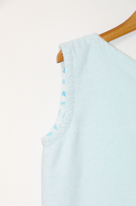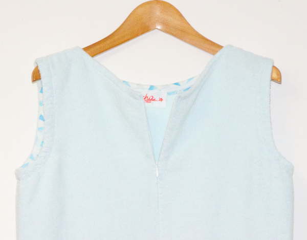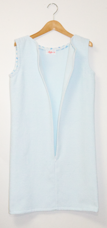 薄手でとても柔らかい高品質な綿100%生地。水色のタオル地でできた夏のワンピース。着丈89センチでひざ丈少し上(ウエストから裾まで約50センチ)。全体にピッタリめ。