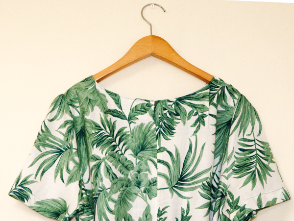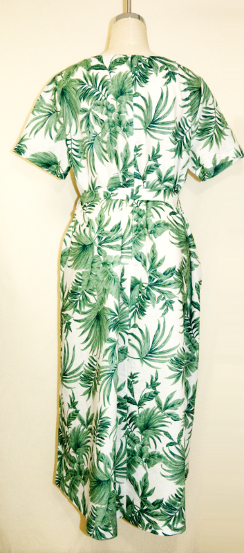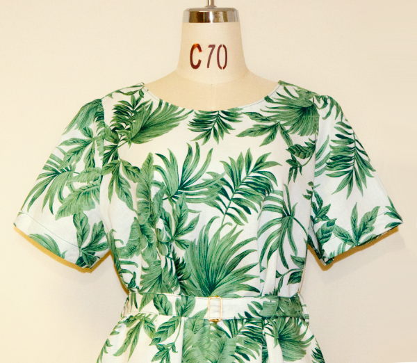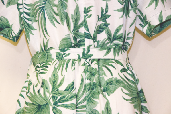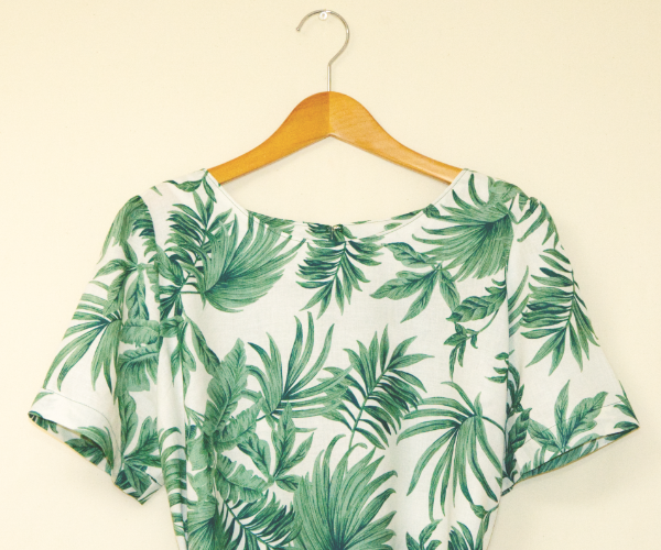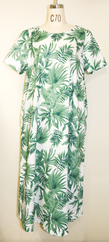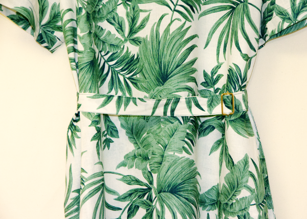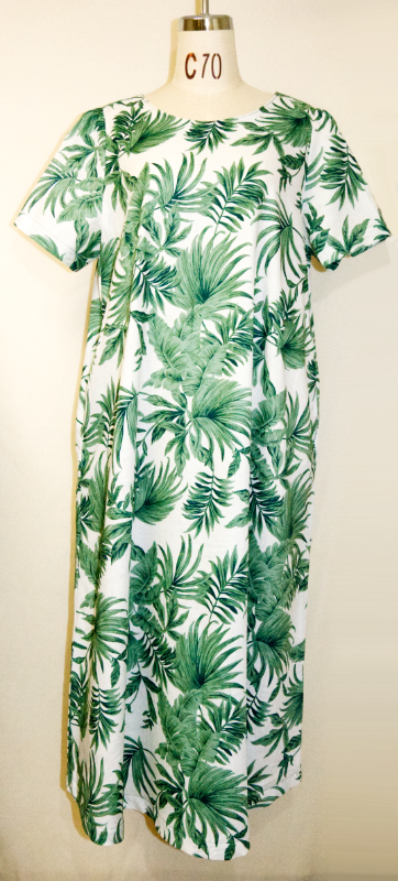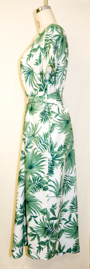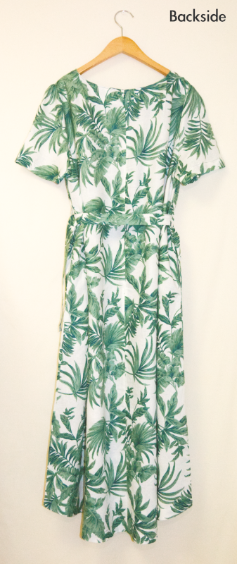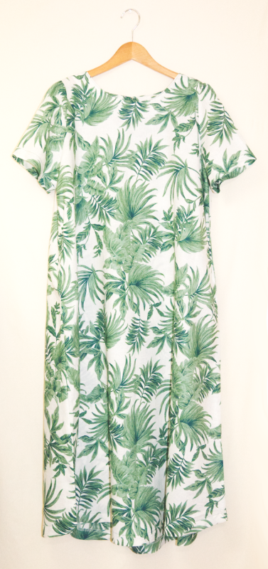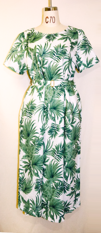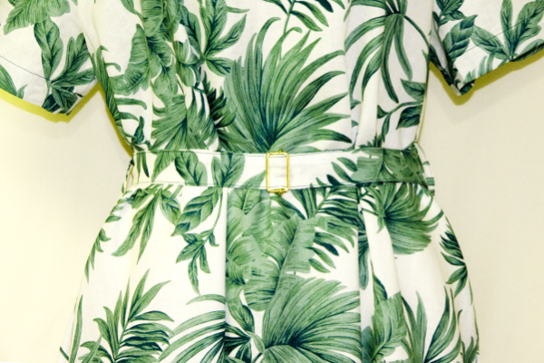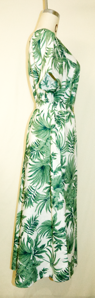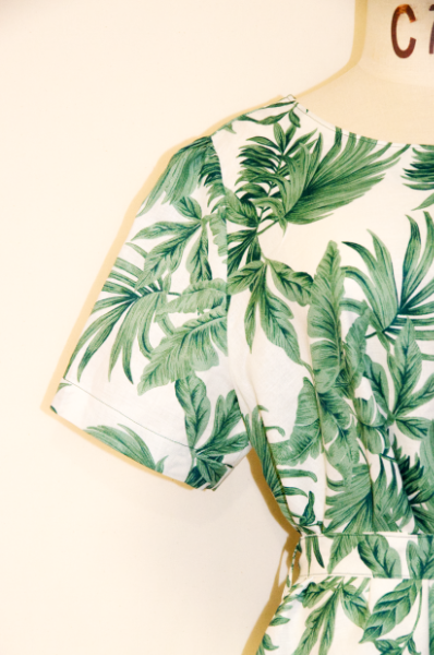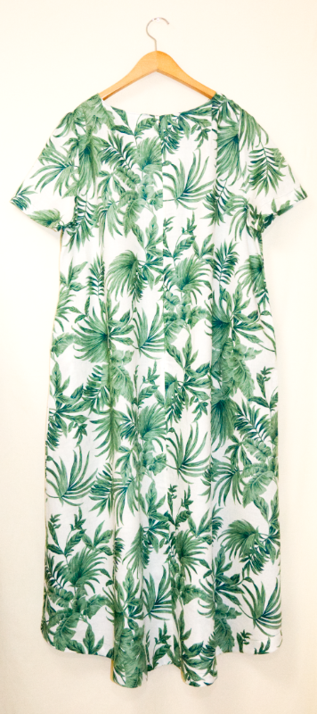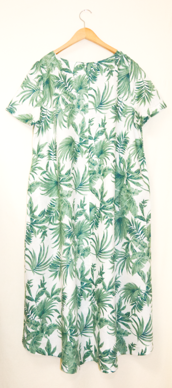 涼しい麻100%の半袖ワンピース・植物柄のデザイン