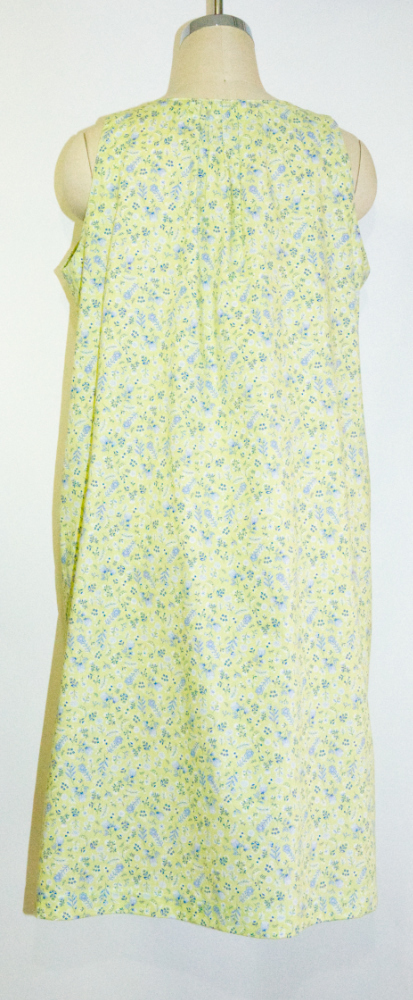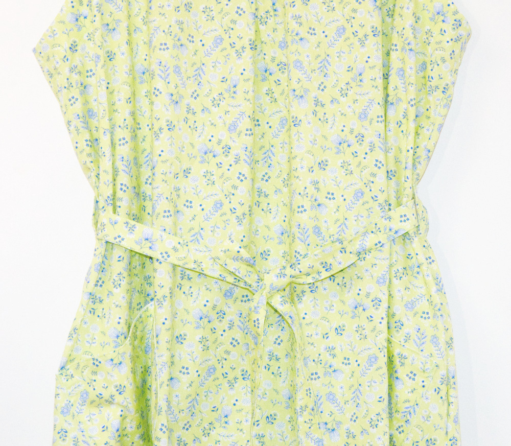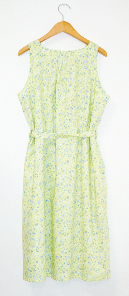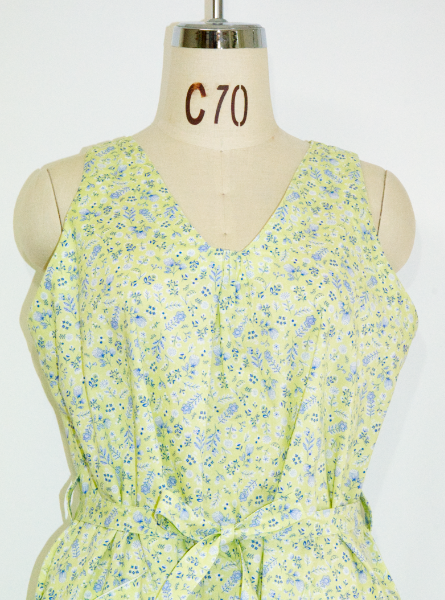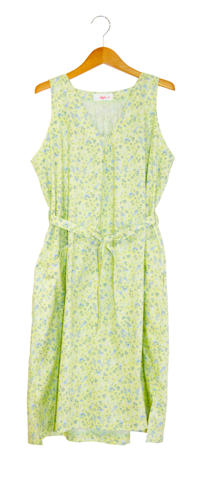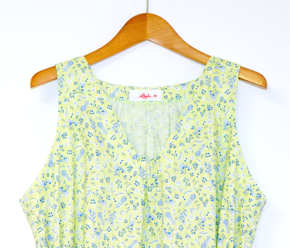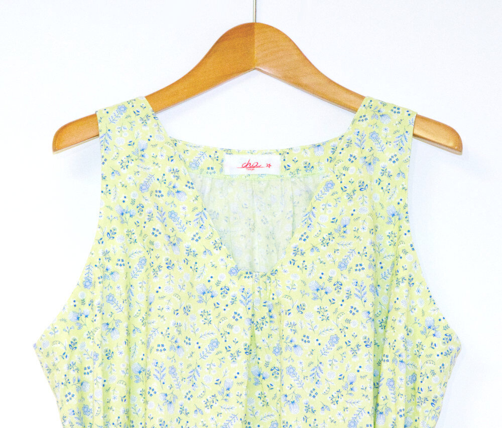 薄手のコットン100%のシーチング生地で作られた花柄ノースリーブワンピース。爽やかな薄緑色。