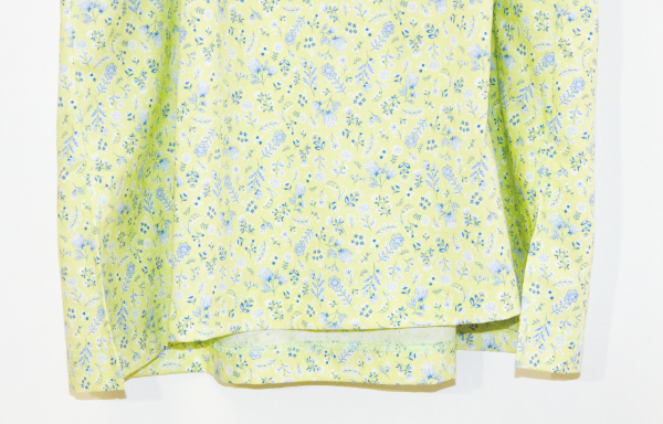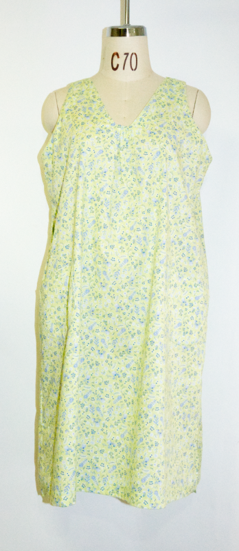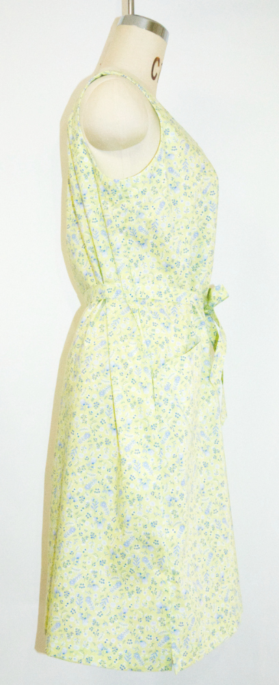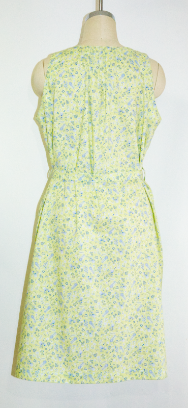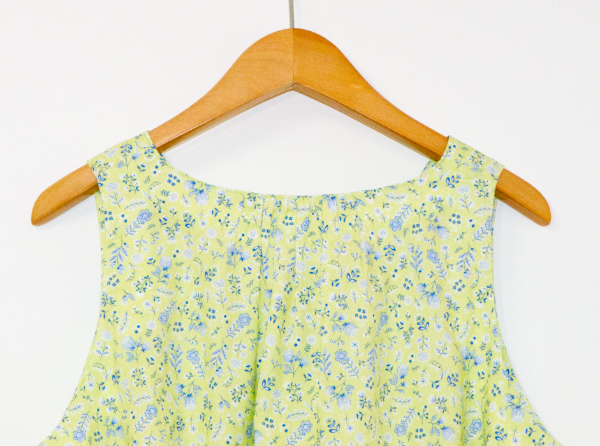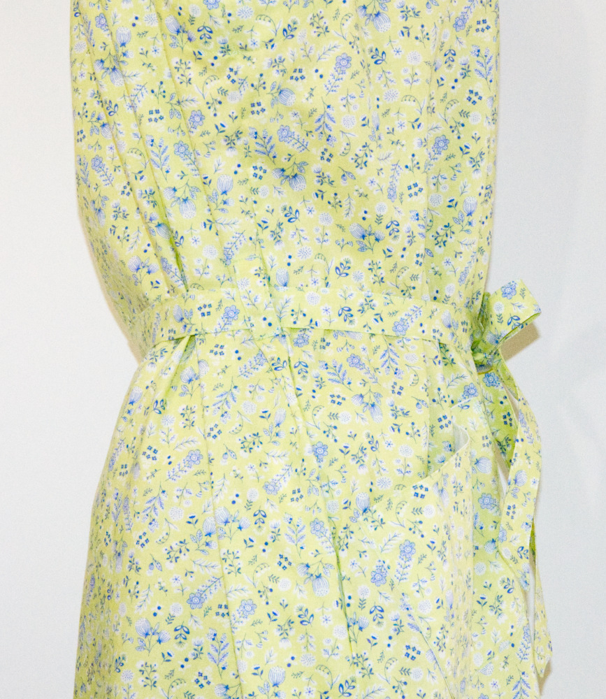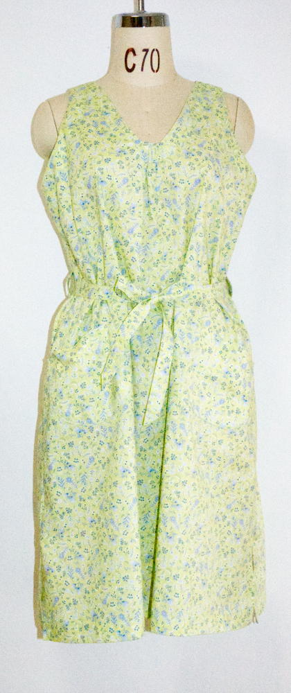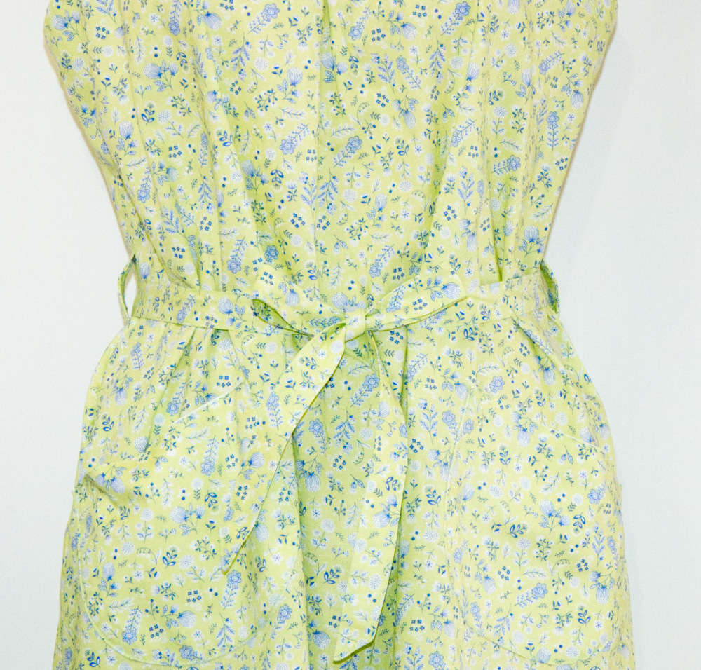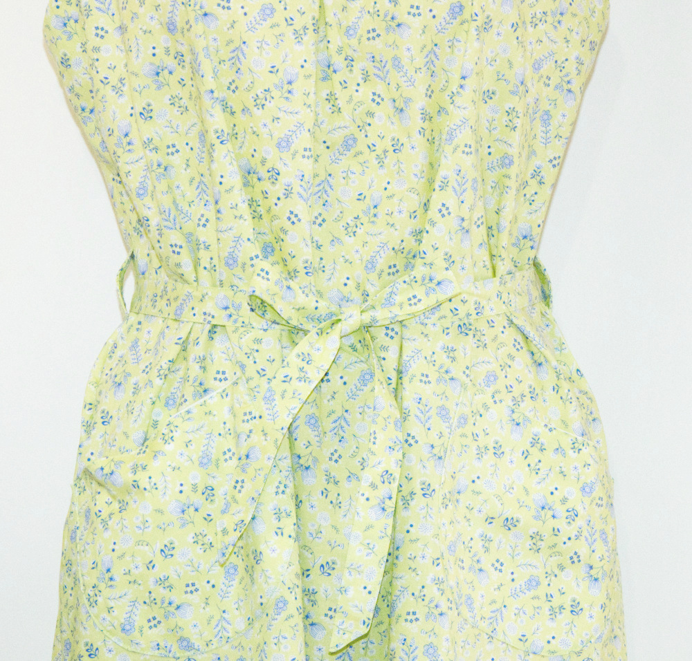 薄手のコットン100%のシーチング生地で作られた花柄ノースリーブワンピース。爽やかな薄緑色。