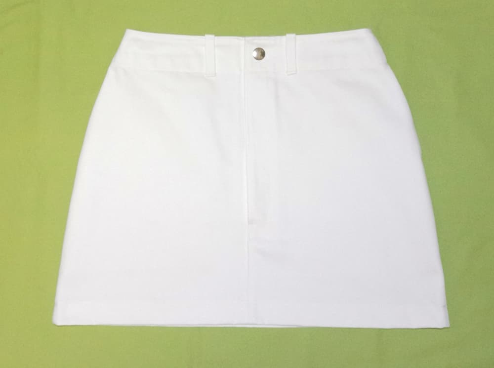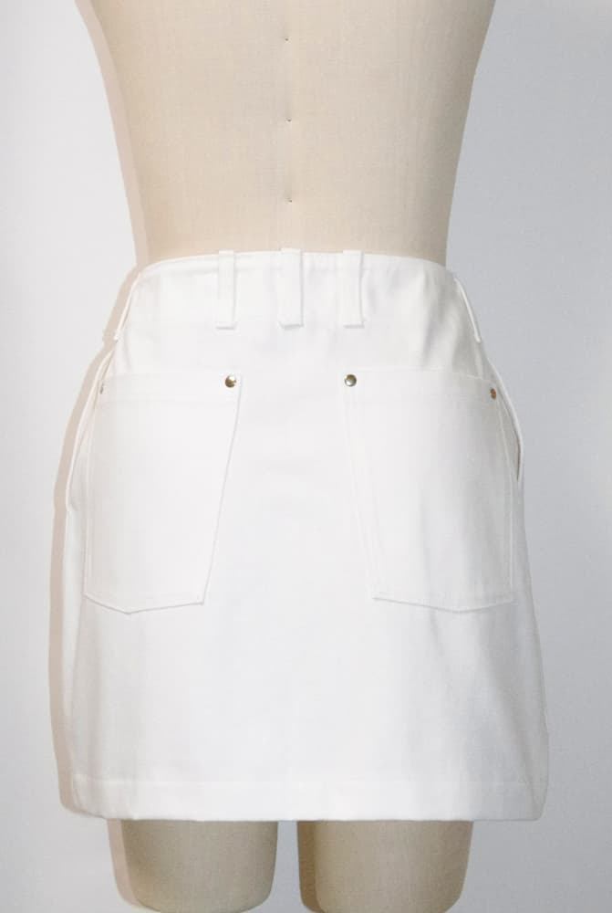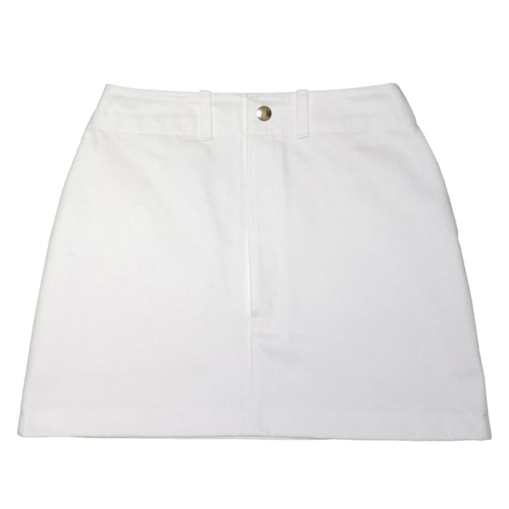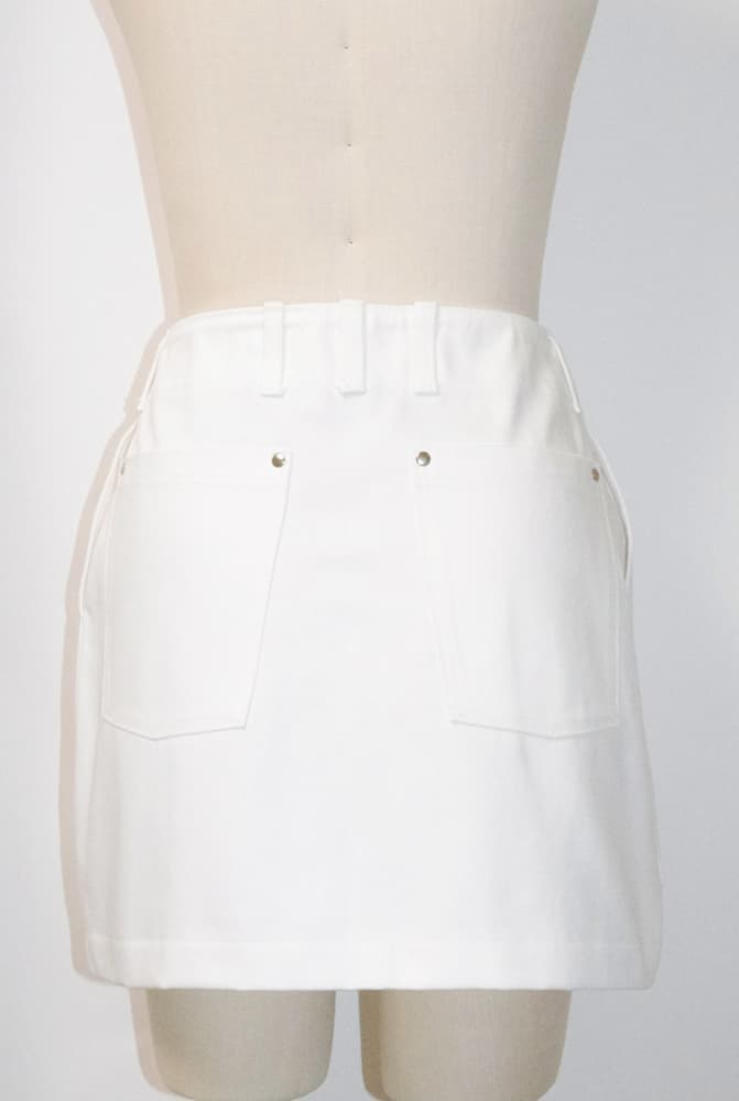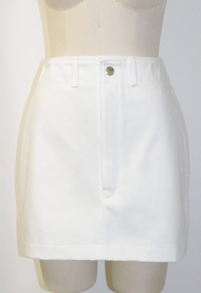 しっかりした中厚生地で作られた白のデニムミニスカート