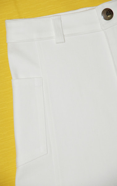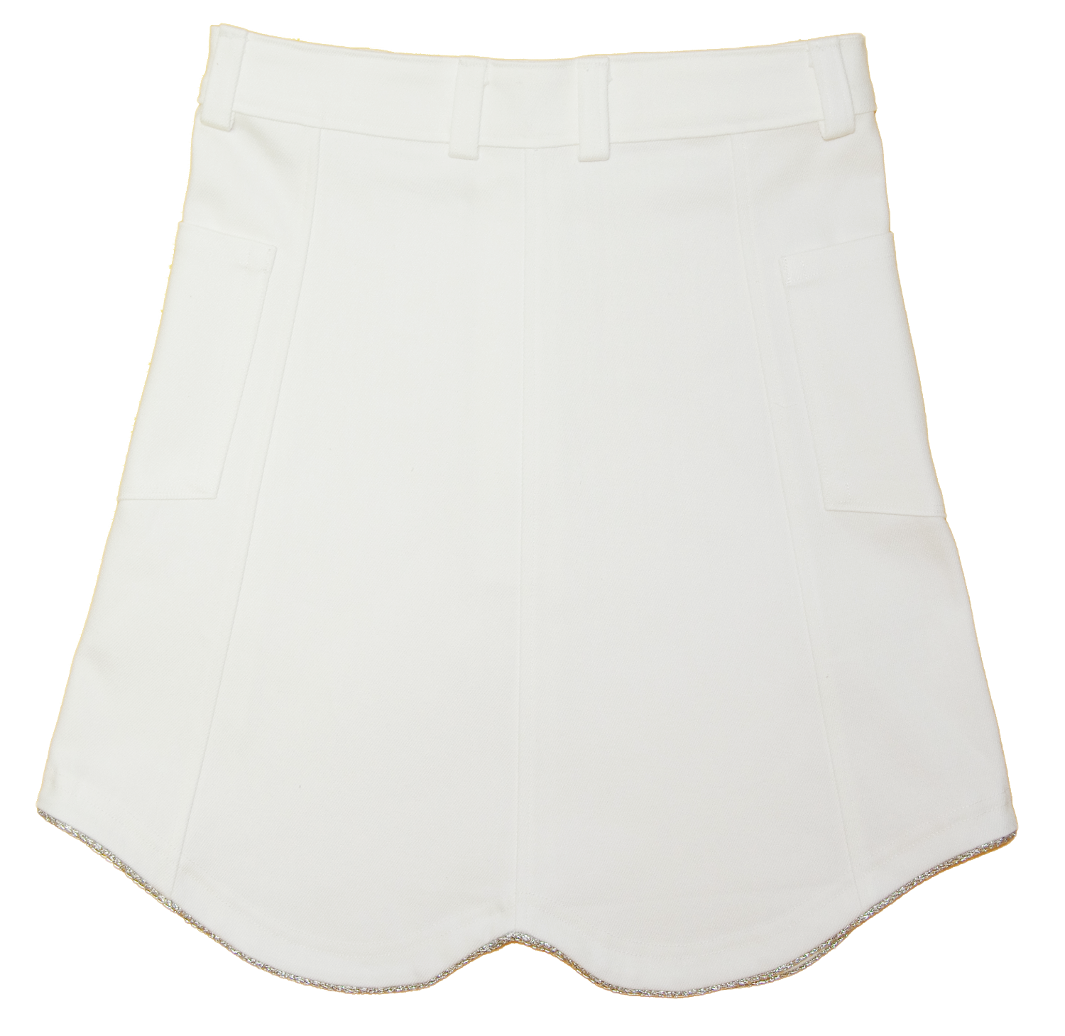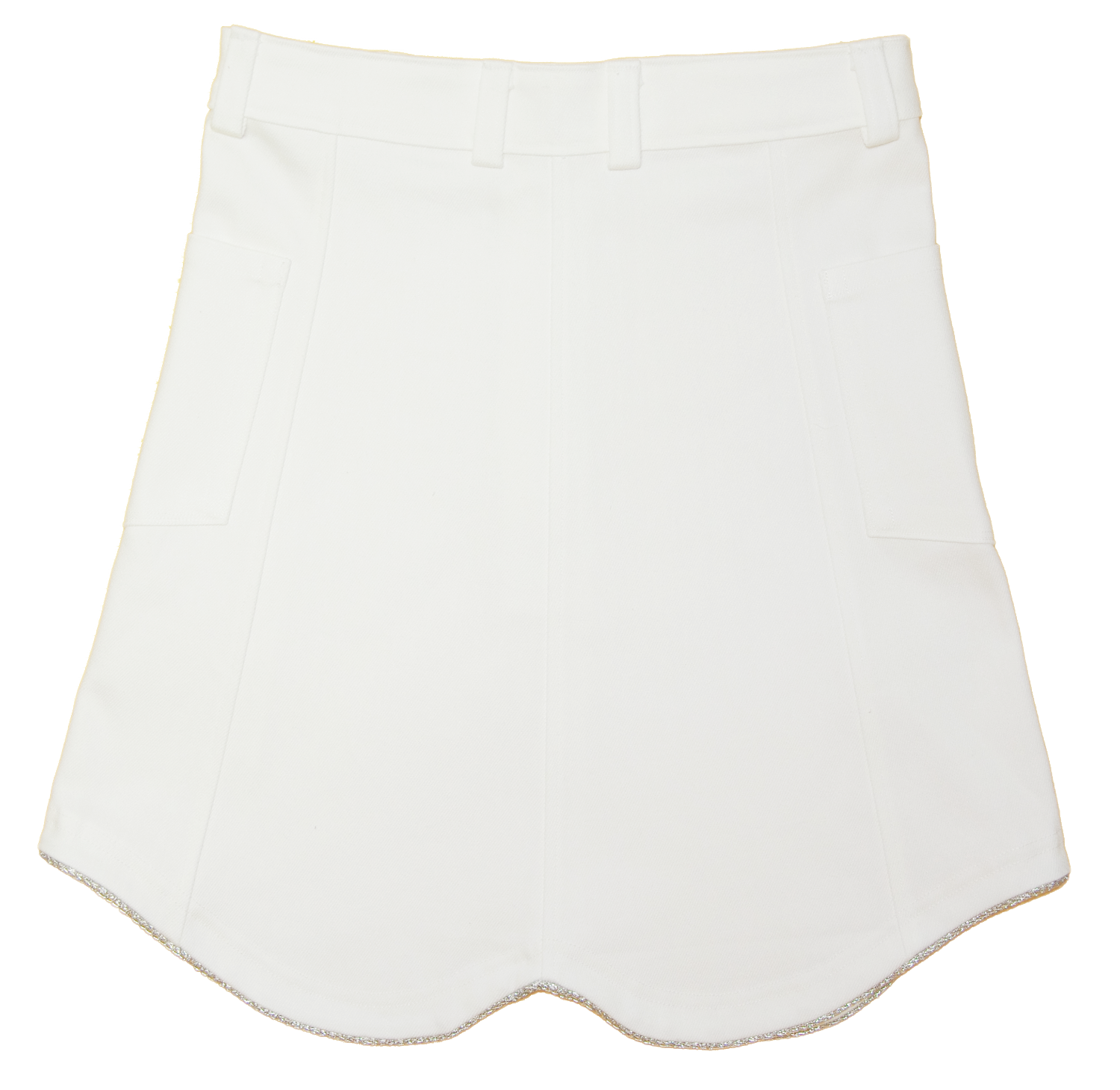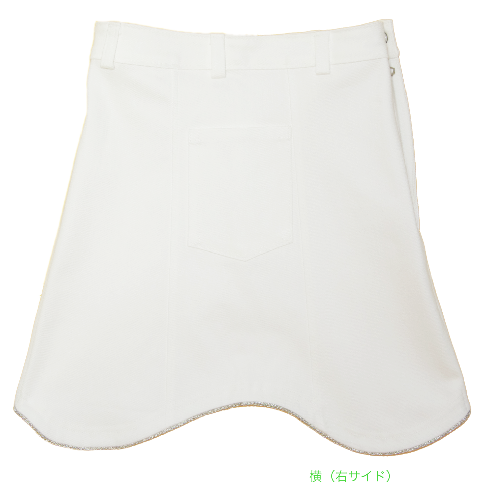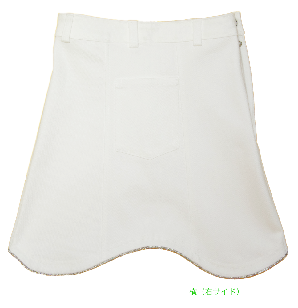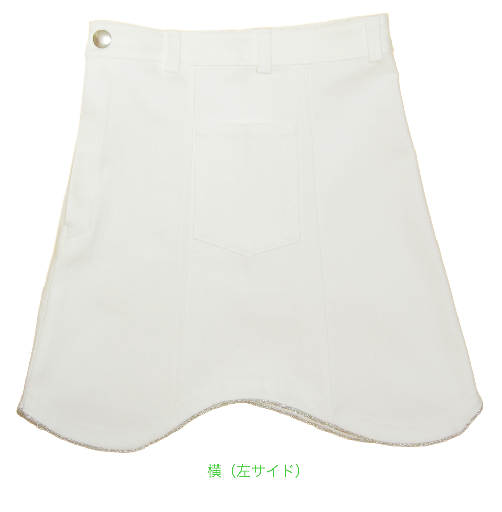 ストレッチ生地のデニムスカート。ポケットを両サイドに付け、裾はウェーブに。
