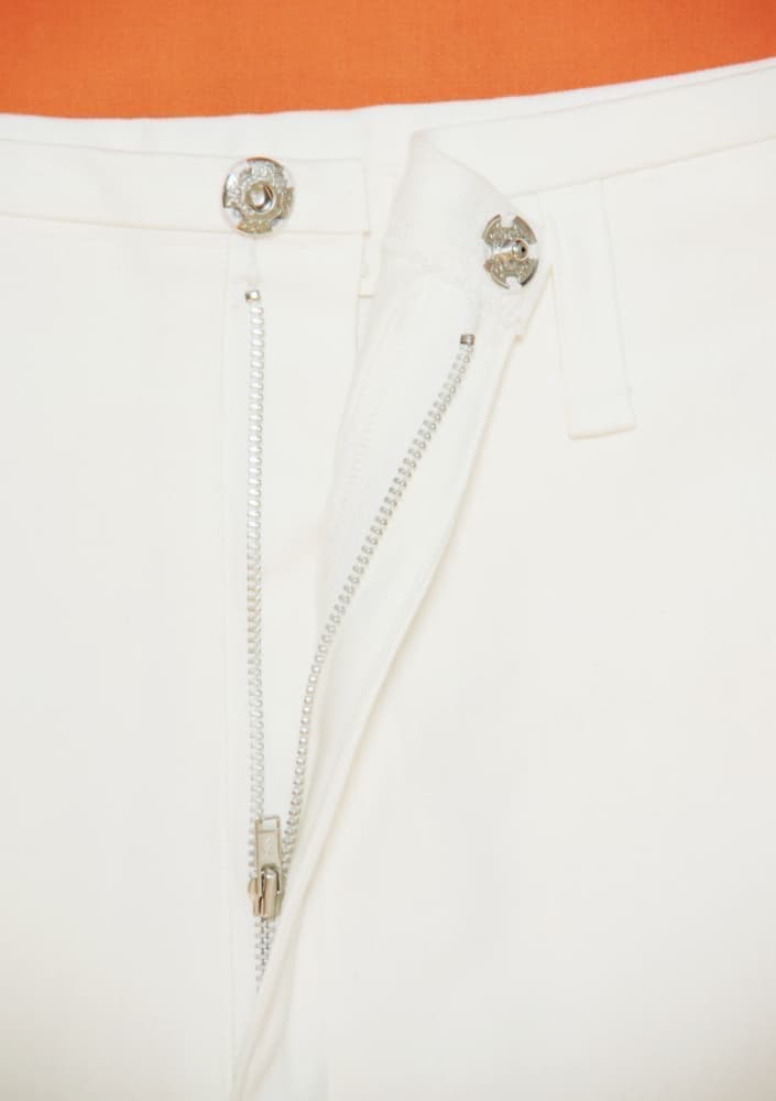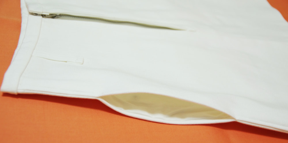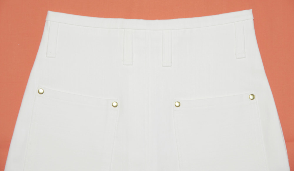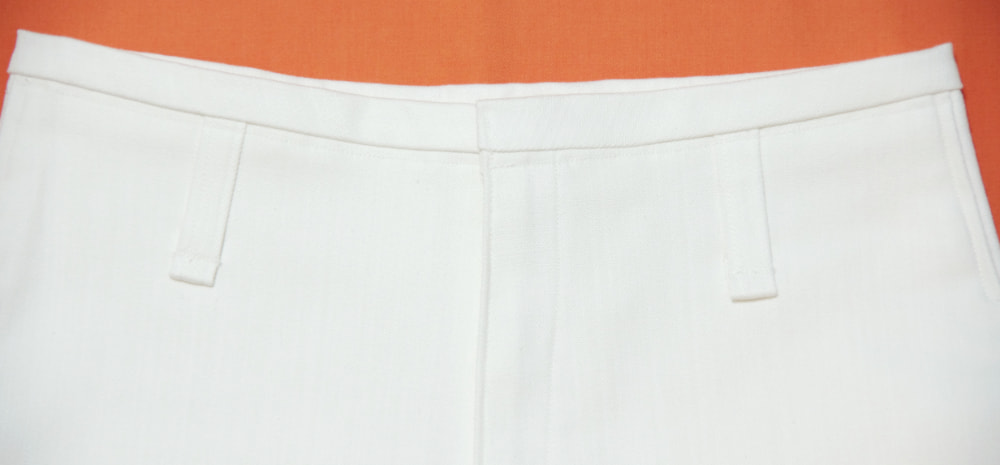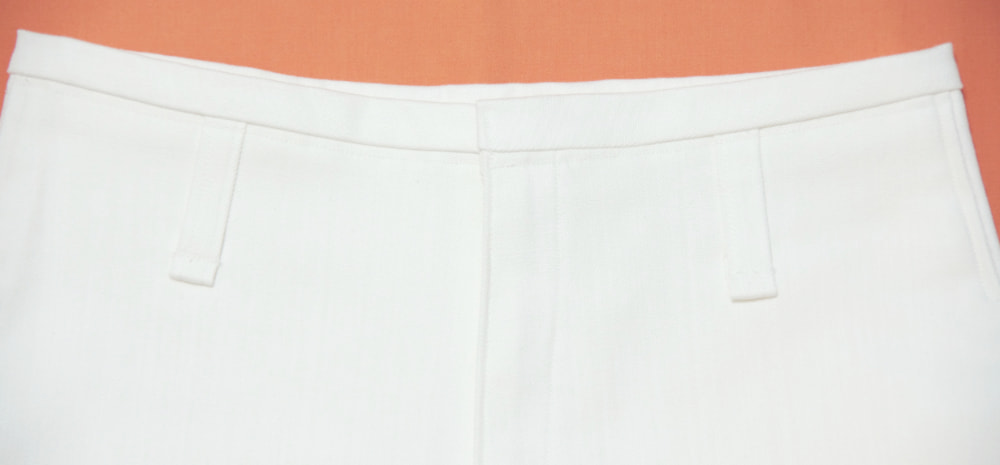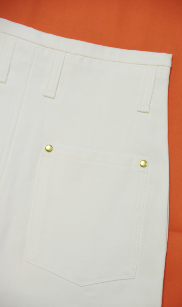 春、夏、秋向き。通常前にあるウエストのボタンを無くし、内側の大きめのホックで止めるタイプ。
