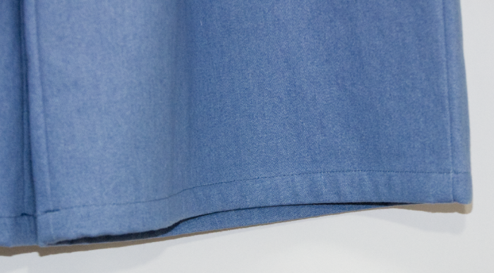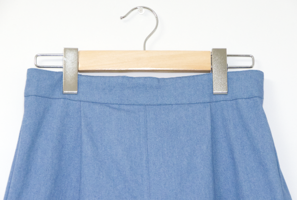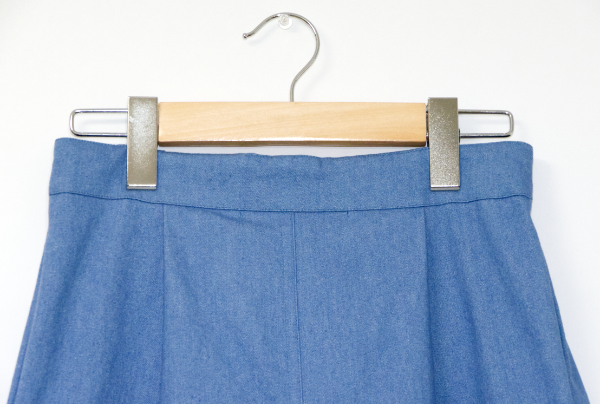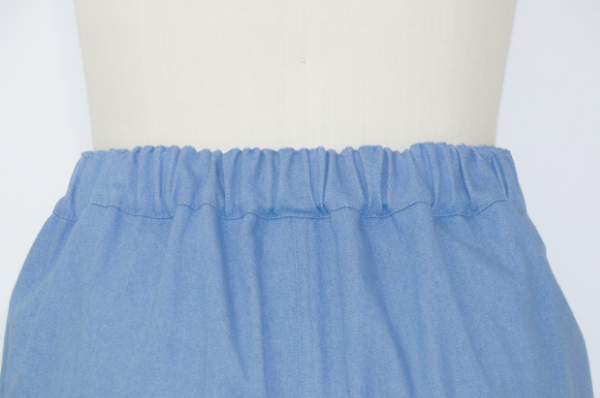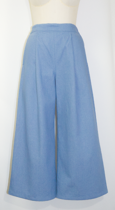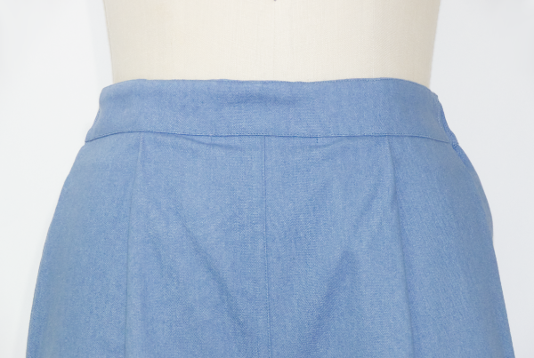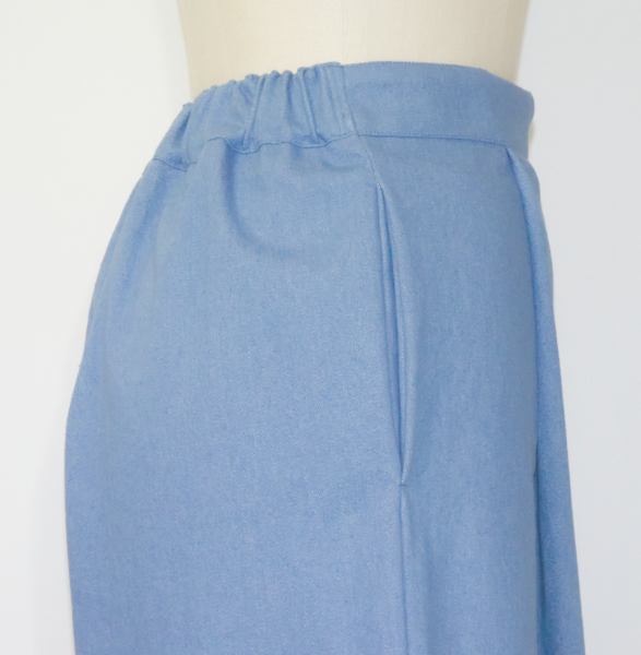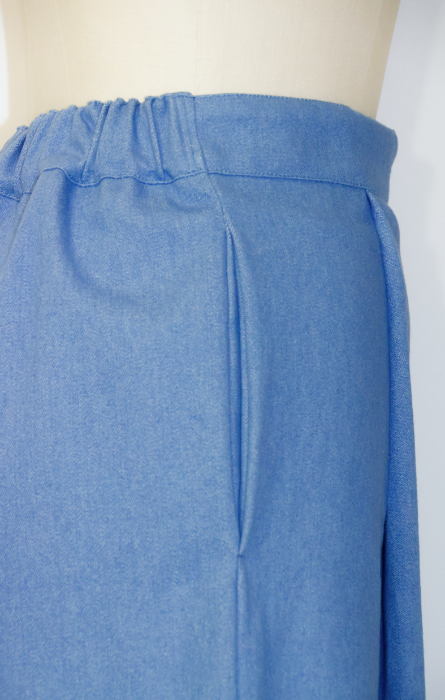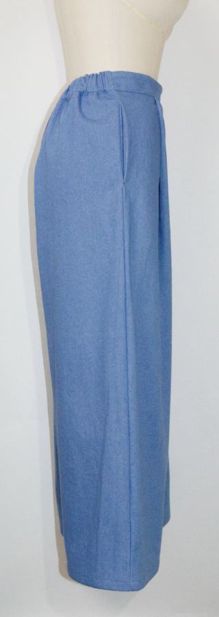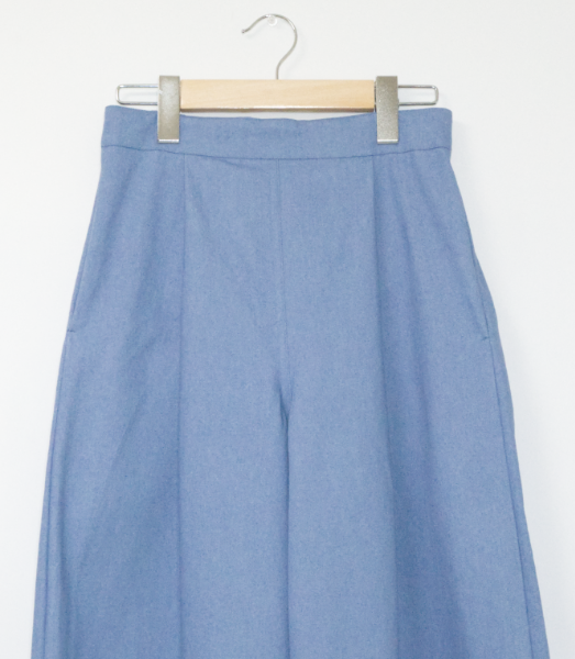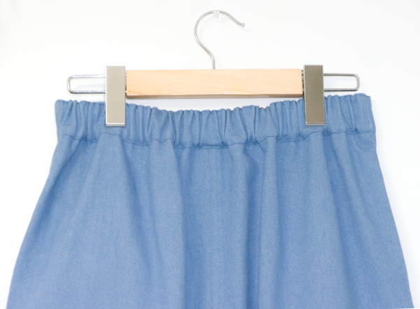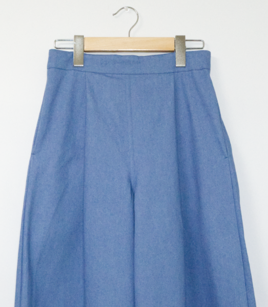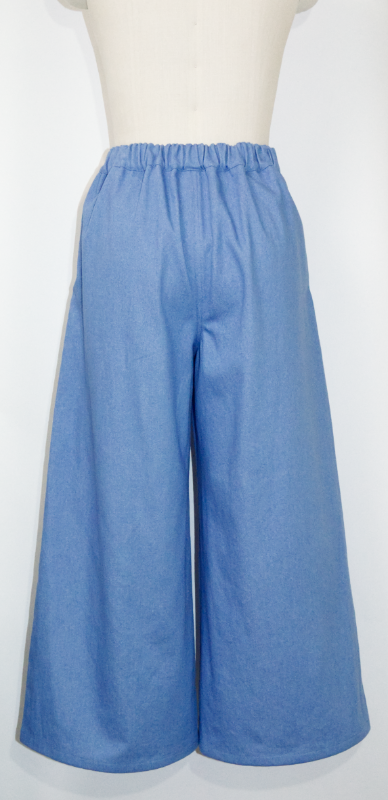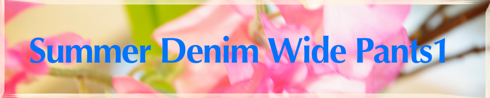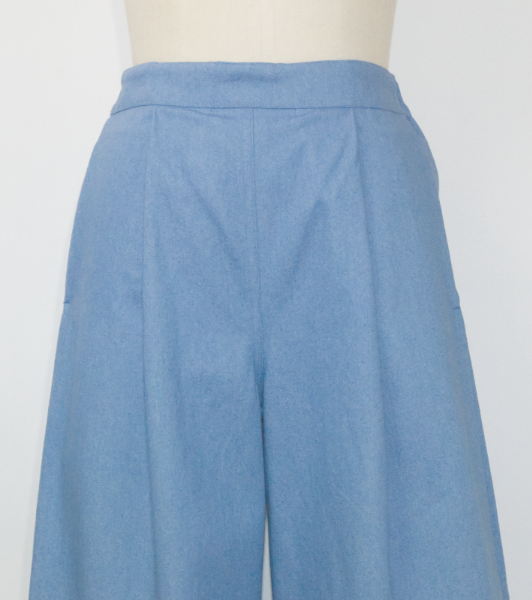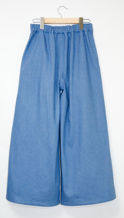 夏のデニムのワイドパンツ。ウエストは、前側がタックで、後ろがゴム入り。ウエストは約68センチ。デニムは中厚でライトブルー色。