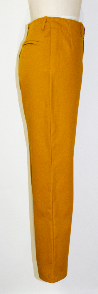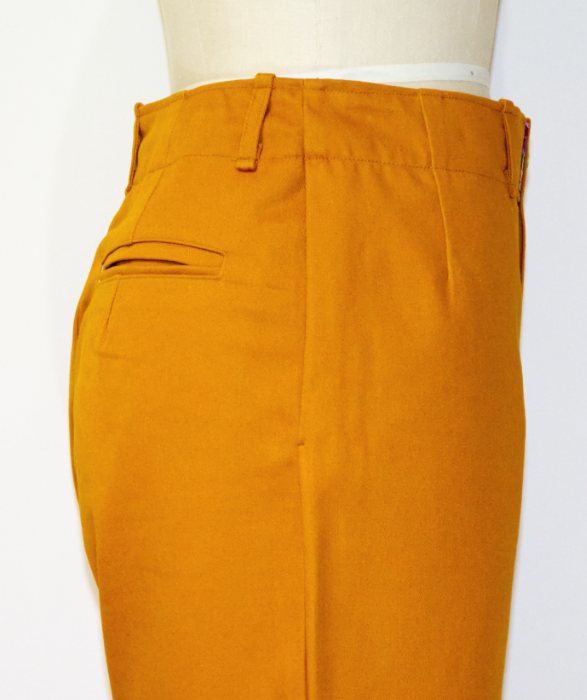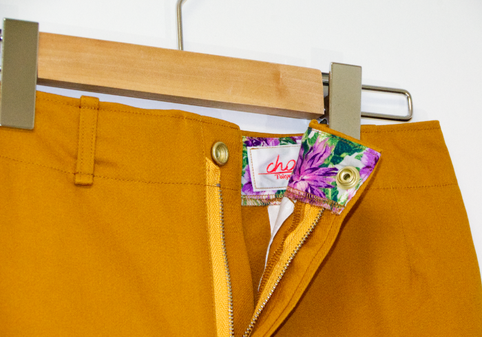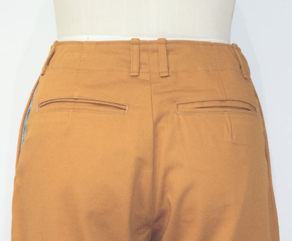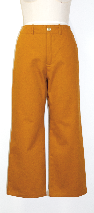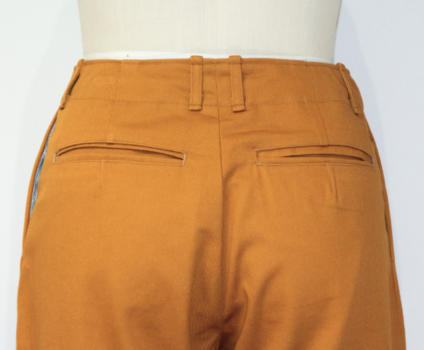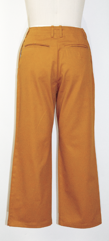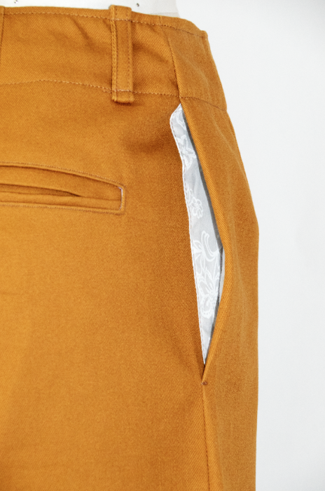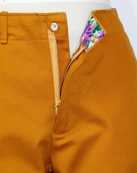 ソフトチノ生地(綿100%)で作られた秋色のチノパンツ。ウエストの裏地はお洒落な花柄。